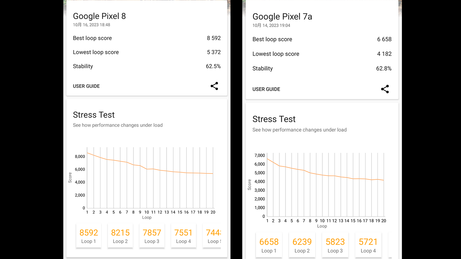 そしてパフォーマンスの持続性を調べるために3D Mark Wild Life Stress Testをやってみましたが安定率で見れば62%程度とほぼ同じでPixel 8の方がパフォーマンスが高い状態で同程度安定しているとイメージした方が分かりやすいと思います。