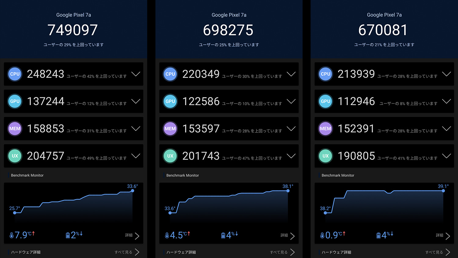 また最高温度で見るとPixel 7aは40度を超えていないのにPixel 8は2回目の途中で達成。一方で計測終了ごとに外部温度を計測してみましたがPixel 7aは34.1/35.6/36.5度。