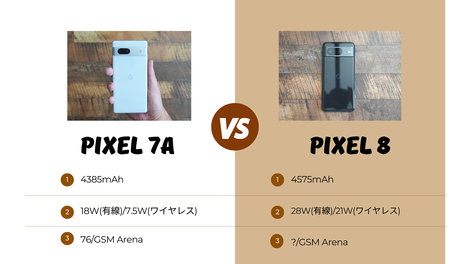 バッテリー関連を確認するとPixel 8の方が小さいながらもバッテリー容量は大きめです。執筆時点で海外サイトがバッテリーテストの結果を公開していないことに加えPixel 8も最適化が終了していないため現時点で電池持ちを評価するのは難しいですがPixel 8の方がマシ。