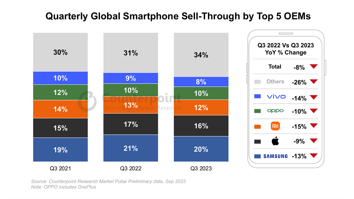 今回の情報によると2023年第3四半期は前年対比で出荷台数が8%減少したことに言及。これで9四半期連続での減少とスマートフォン市場は非常に厳しい状況になっていることを指摘しています。