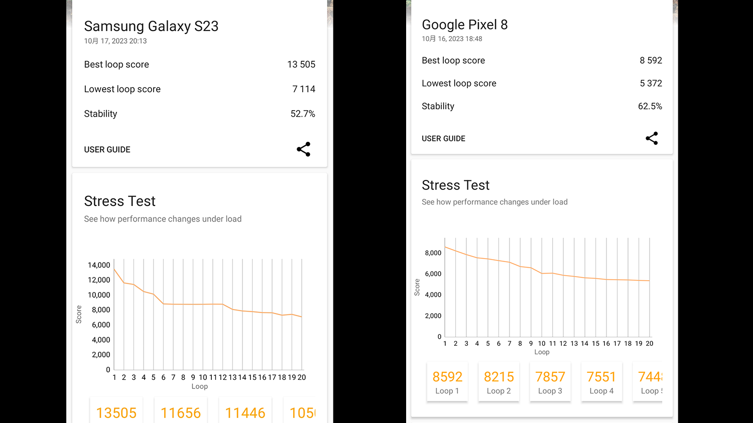 また合わせて3D Mark Wild Life Stress Testをしてみましたが安定率はPixel 8の方が62.5%のため上でスコアだけで見ればGalaxy S23の方が不安定という感じになります。少なくとも今回のベンチマークで判断する限りGalaxy S23の方がパフォーマンスの持続性は悪い。