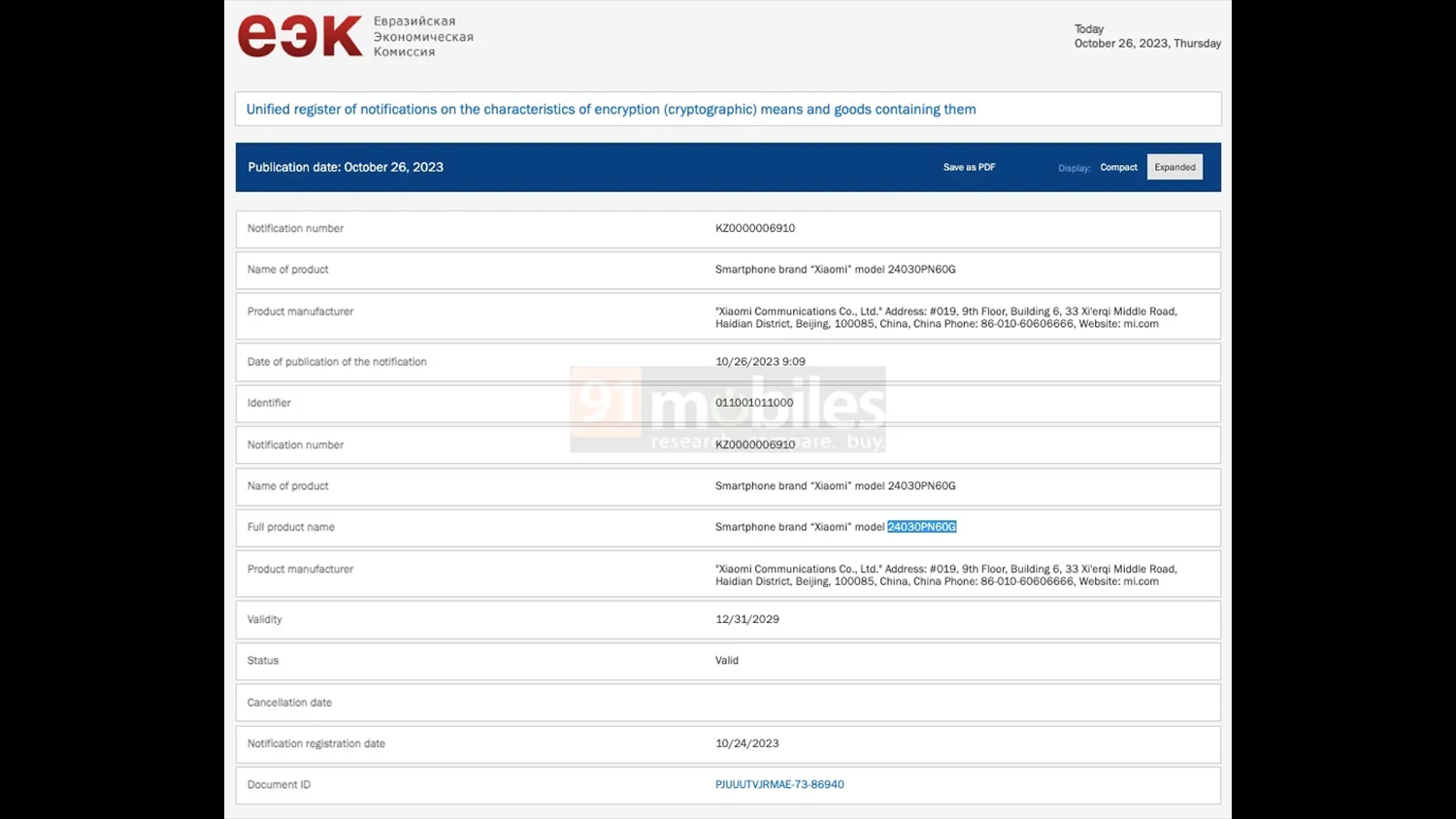 今回の情報によるとECC(ユーラシア経済委員会)でXiaomi 14 Ultraの存在が早くも確認されたとしています。今回判明したモデル番号を確認すると「24030PN60G」となっており最初の数字が「2403」となっていることからも2024年3月に正式発表される可能性があること。