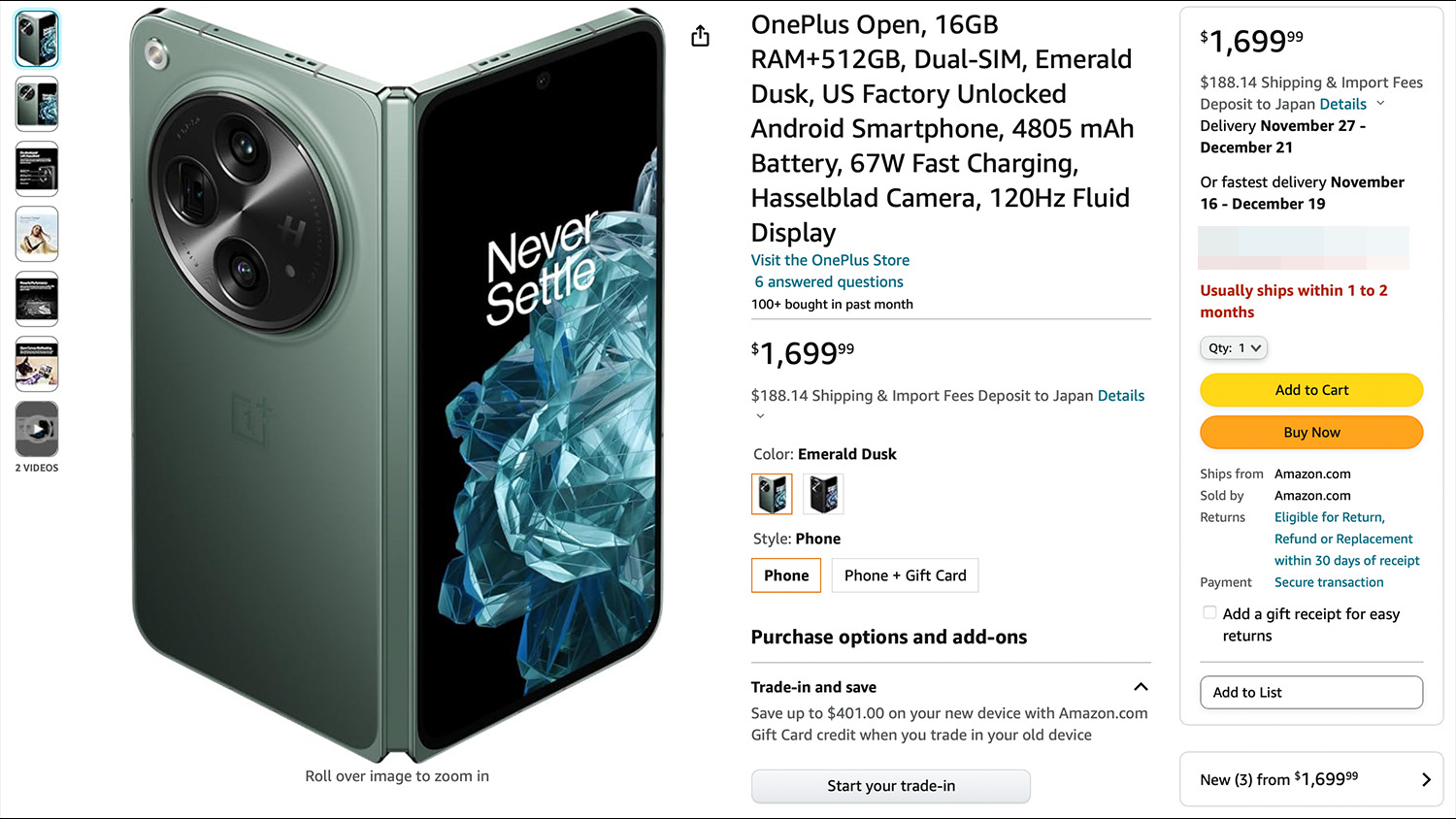 さて今回米AmazonにおいてOnePlus Openの初期在庫が完売していることが判明したので簡単にまとめたいと思います。