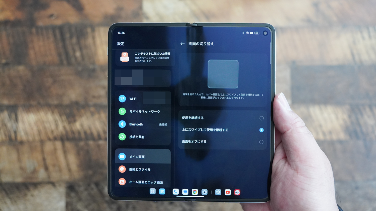Oppo Find N3はメインディスプレイを閉じた後に3つのオプションから表示可能で下からスワイプすることで継続を選択していますが使わない時は画面がそのままオフになるだけ。