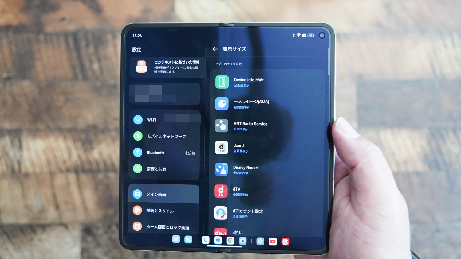 また設定を見逃していたら申し訳ないですがホーム画面のアプリ配置はサブもメインも共通化。なので単純にサブディスプレイ2ページ分がメインディスプレイで見開き表示される感じです。