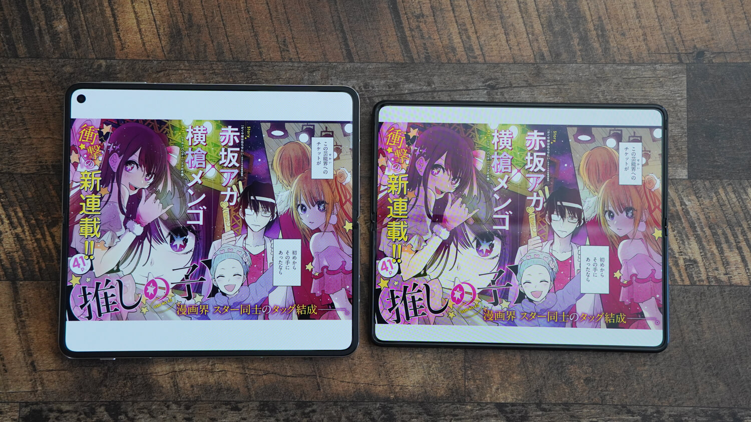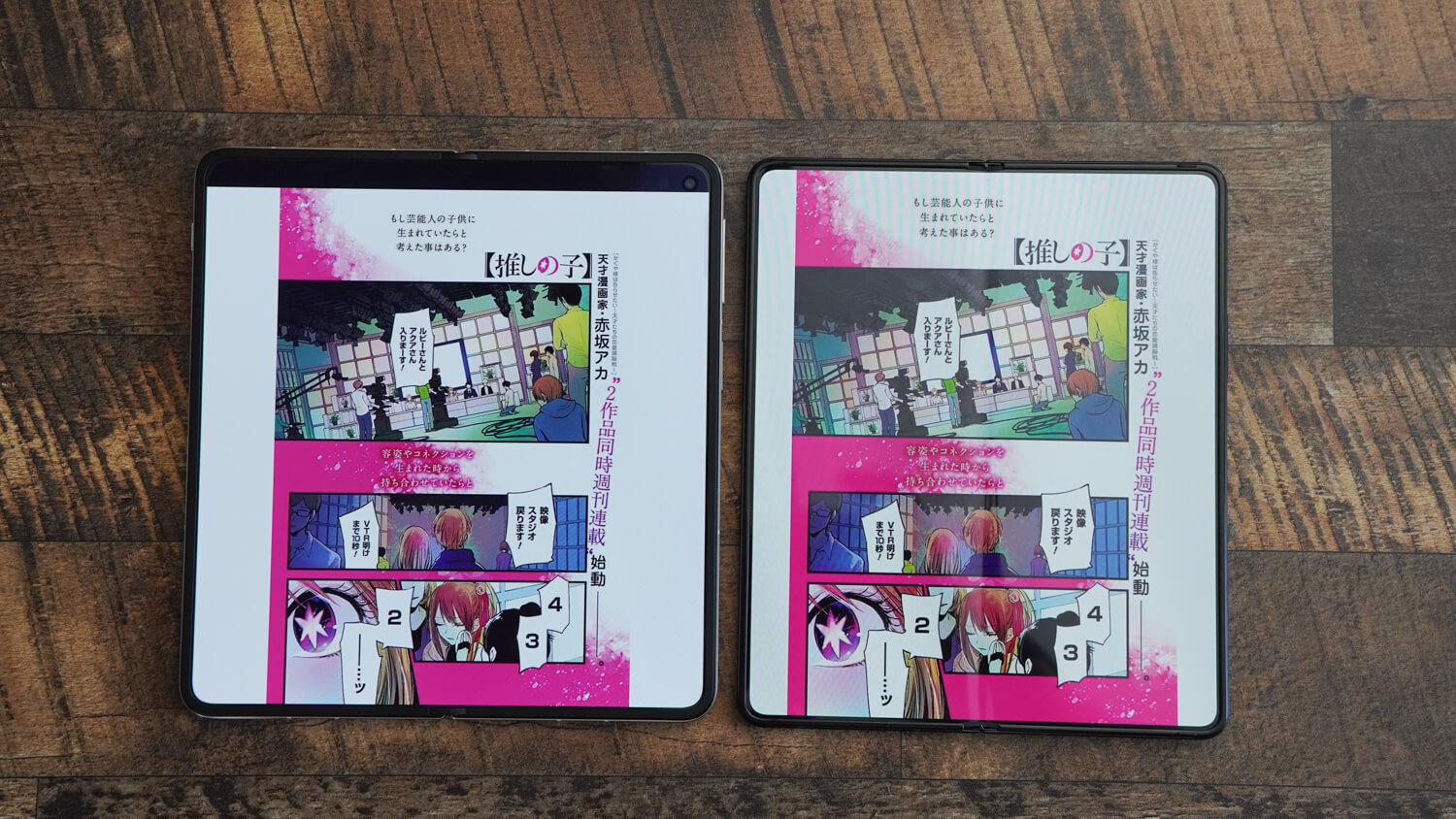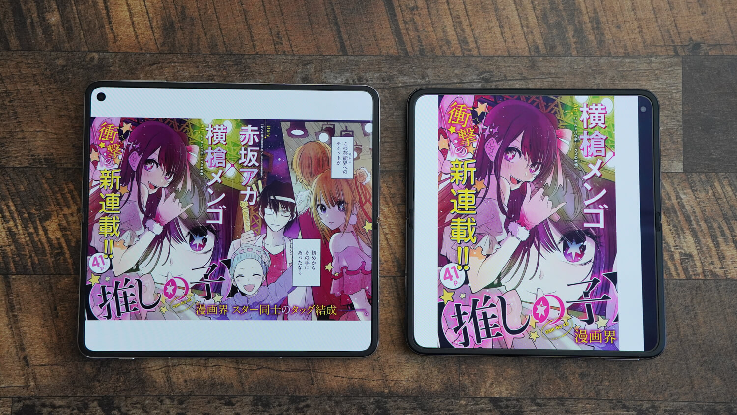 また先ほどと同じ少年ジャンプ+でOppo Find N2と比較してみましたが意外にもほぼ一緒です。単純にOppo Find N2の方が余白が少ないことからもコンテンツの大きさがほぼ一緒という感じ。