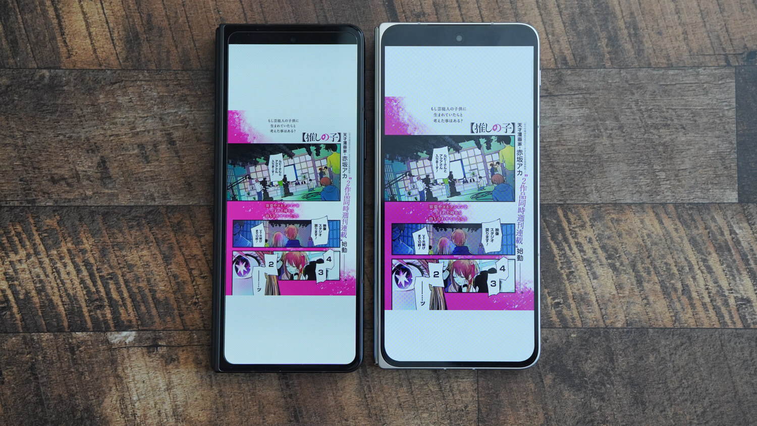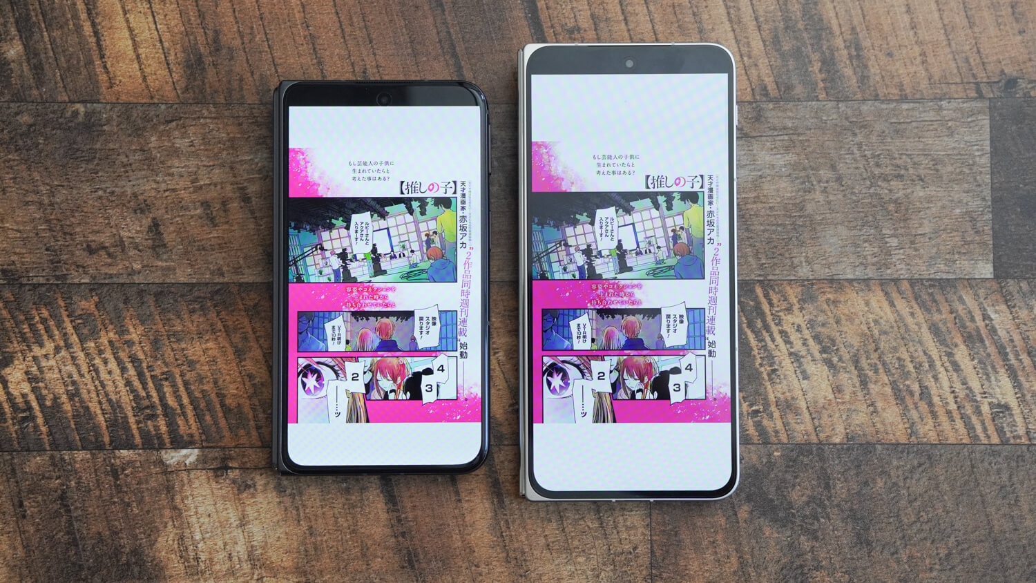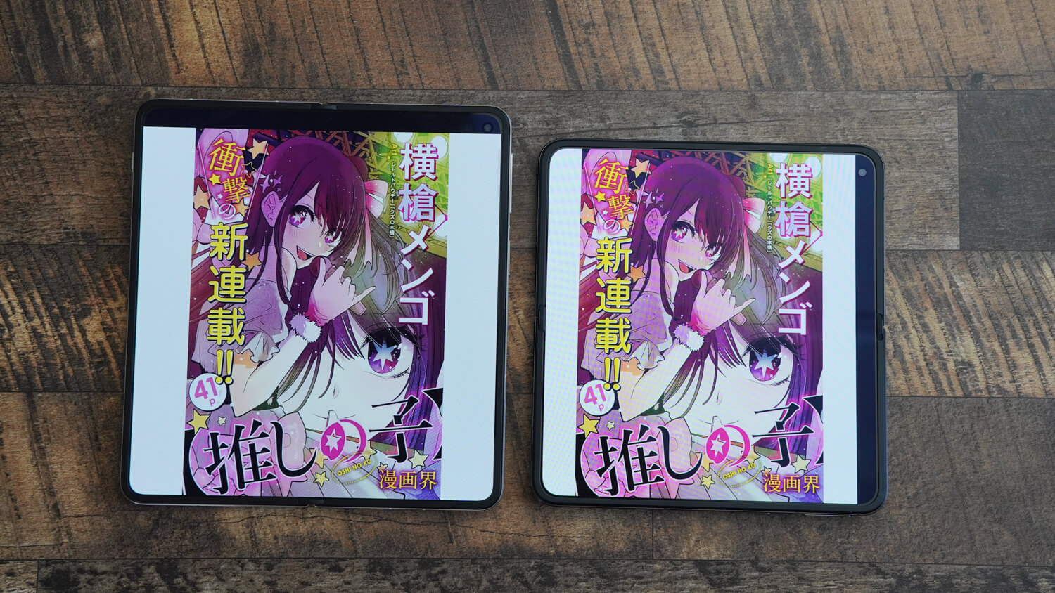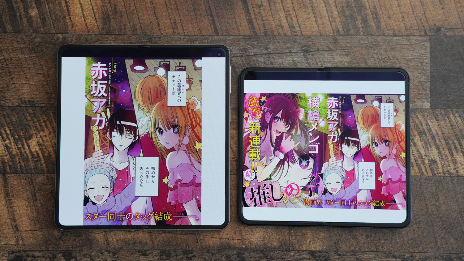 また先ほどと同じ少年ジャンプ+でOppo Find N2と比較してみましたが意外にもほぼ一緒です。単純にOppo Find N2の方が余白が少ないことからもコンテンツの大きさがほぼ一緒という感じ。