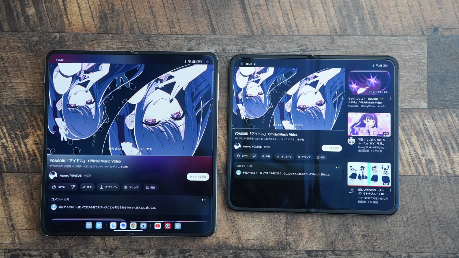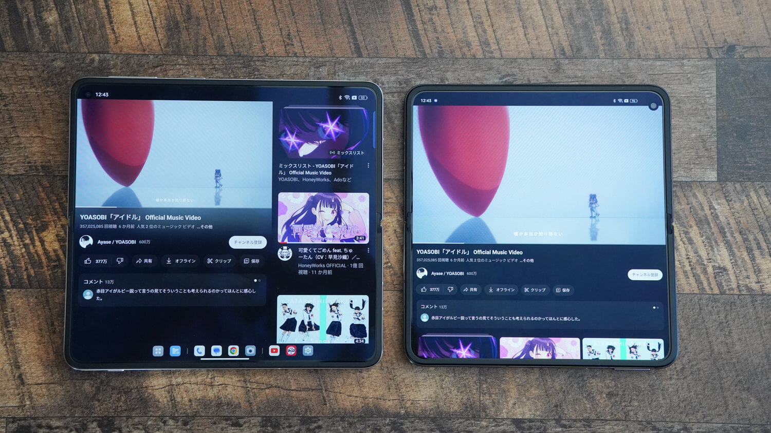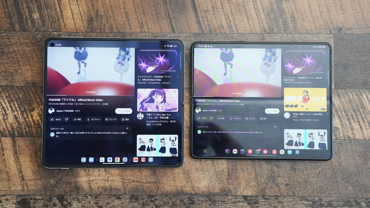 YouTubeを再生してみるとOppo Find N2の方が僅かに横長のためコンテンツが僅かに大きい。ただ一度に表示できる情報量としてはほとんど一緒という感じでほとんど無駄がないように見える。