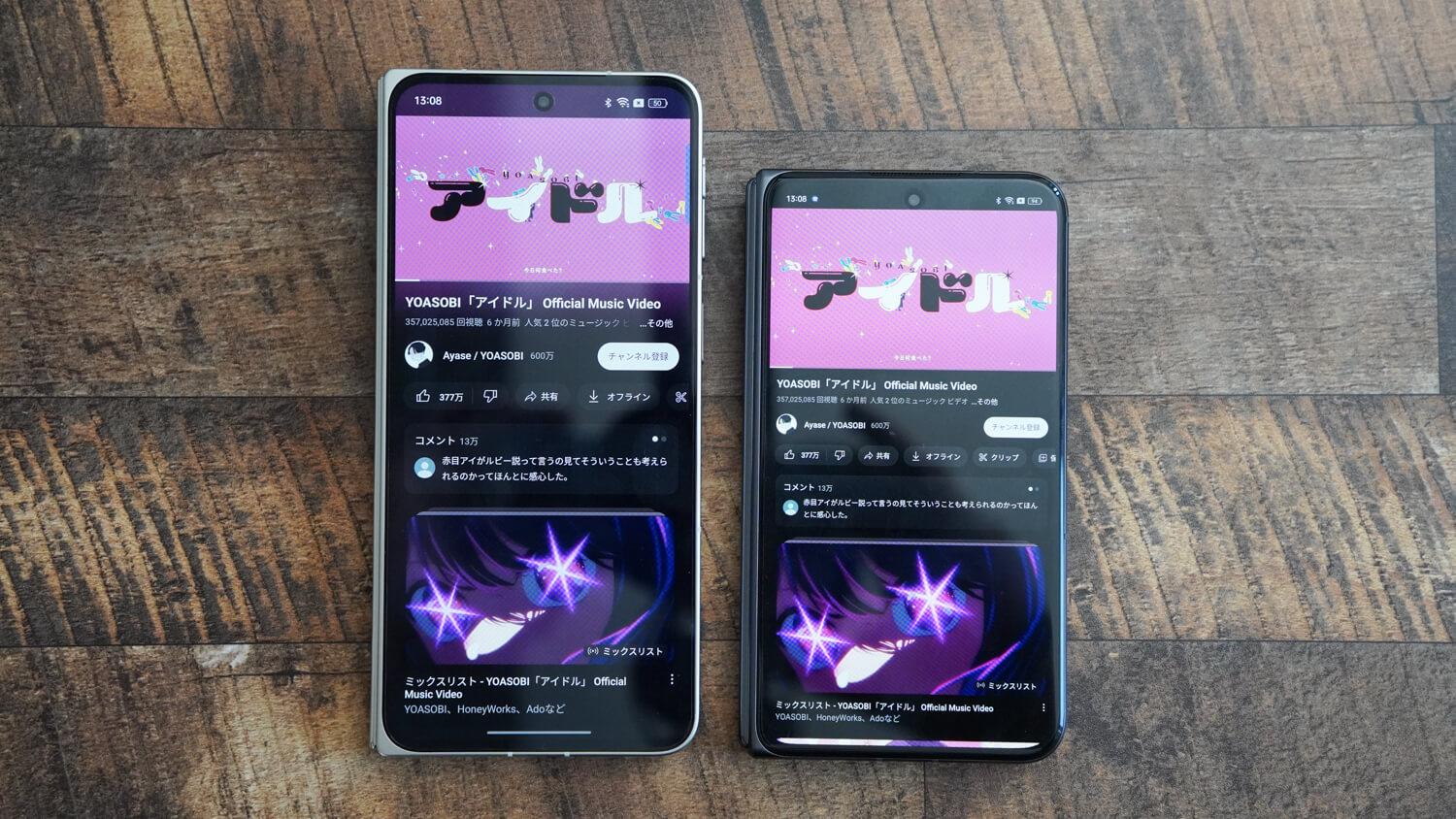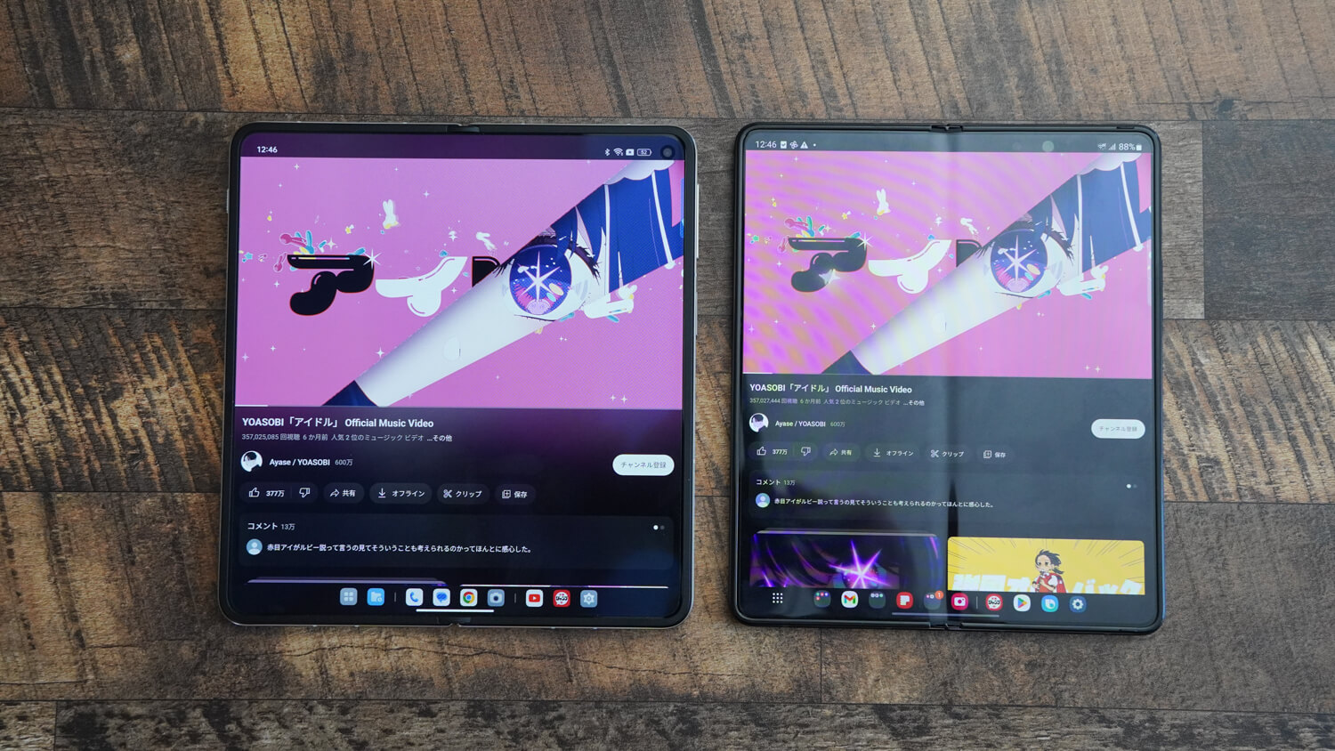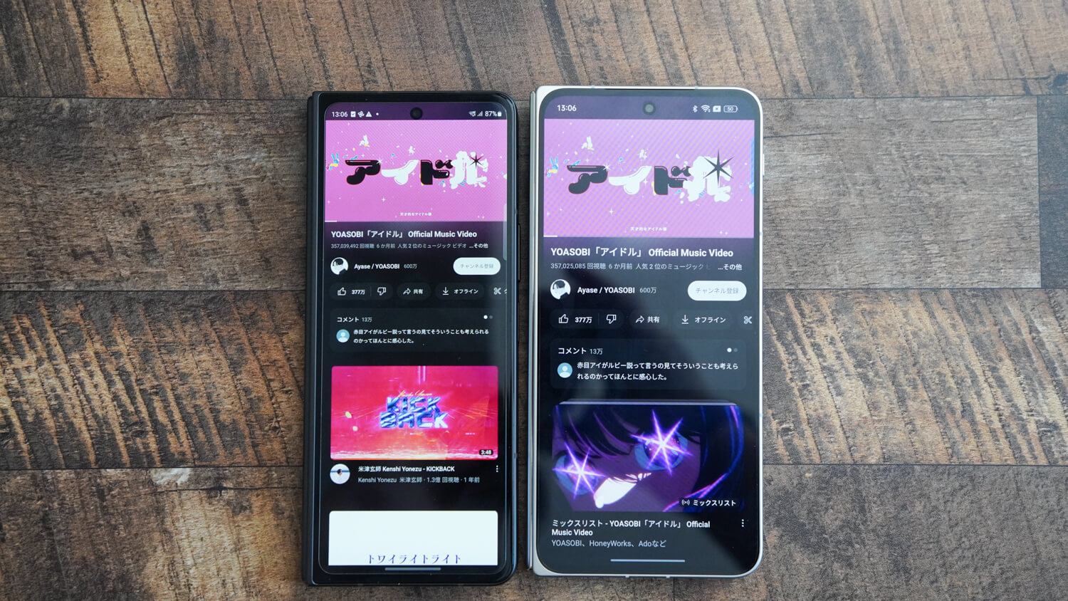 YouTubeを再生してみるとOppo Find N2の方が僅かに横長のためコンテンツが僅かに大きい。ただ一度に表示できる情報量としてはほとんど一緒という感じでほとんど無駄がないように見える。
