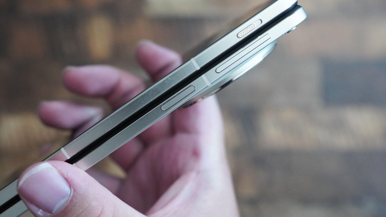 そして本体側面を確認するとミュートボタンに音量ボタンに指紋認証が統合された電源ボタン。