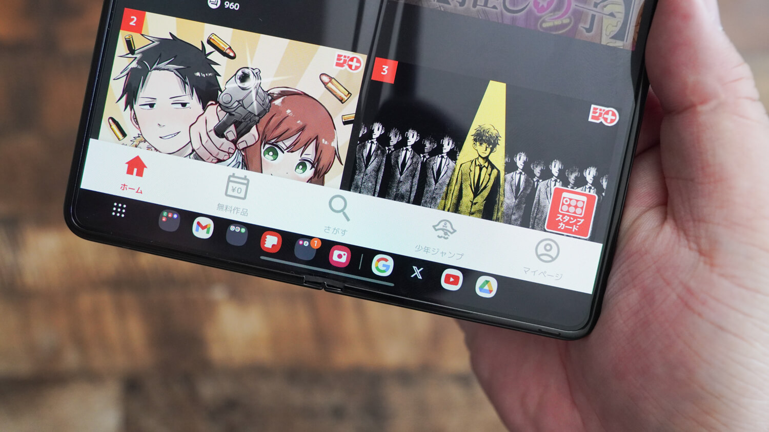 そして先ほどと同じく少年ジャンプ+でコンテンツを表示してみましたが明らかに差があります。Galaxy Z Fold 5の方が横幅スリムということもあり上下に余白が多くなり全体的に無駄が多い。