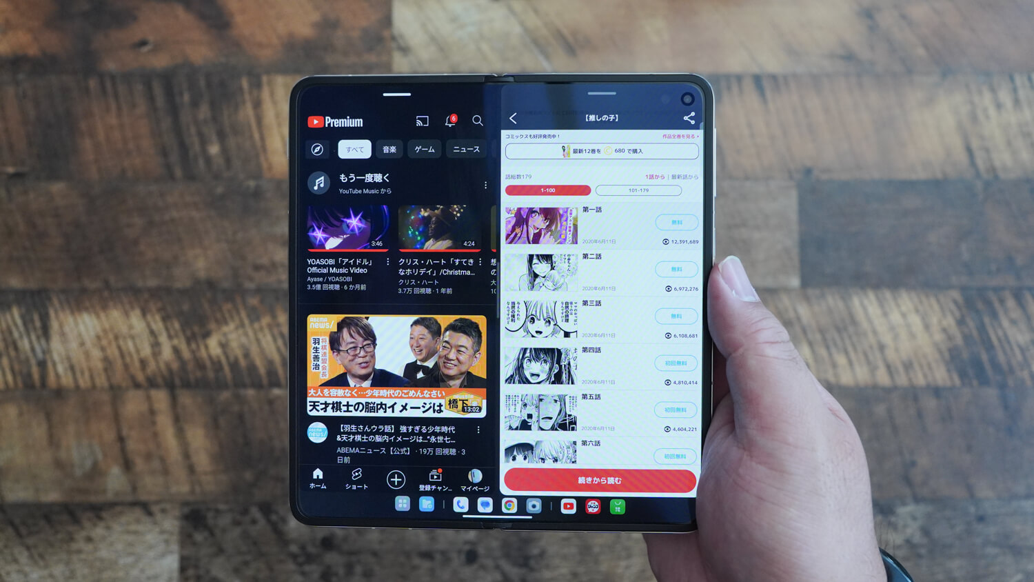 次にYouTubeを再生してみましたがGalaxy Z Fold 5の方が一度に表示できる情報量は多い。ただ肝心のコンテンツは小さめなのでこの状態だとあまり実用性がないかなという印象です。