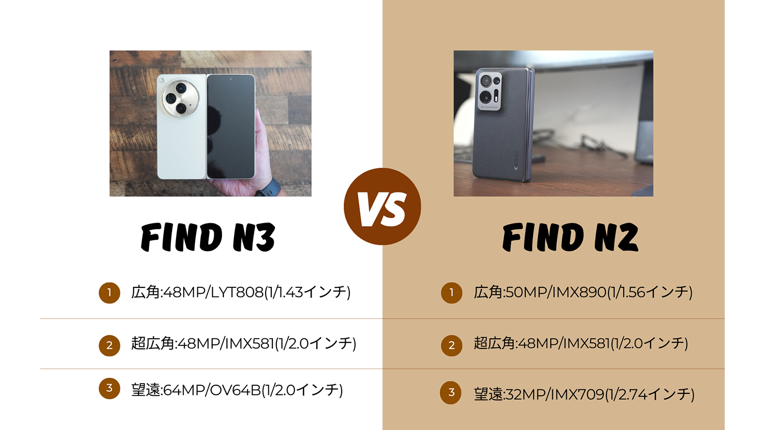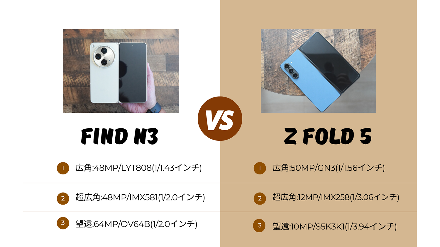 一方でGalaxy Z Fold 5と比較するとセンサーサイズで見ればOppo Find N3の方が大きい。Galaxy Z Fold 5はコストカットのためかセンサーが弱めなので余計に差がついた印象です。