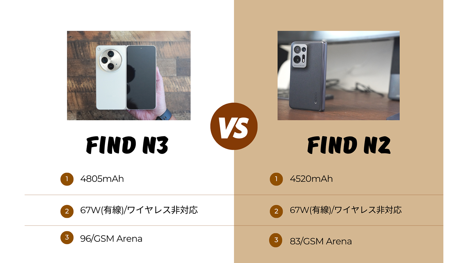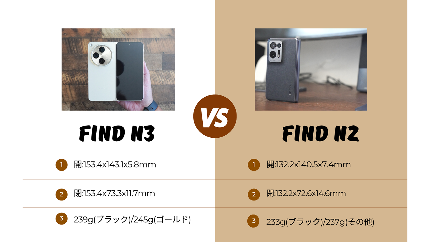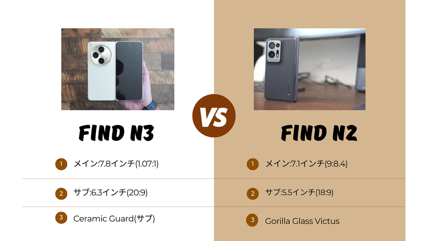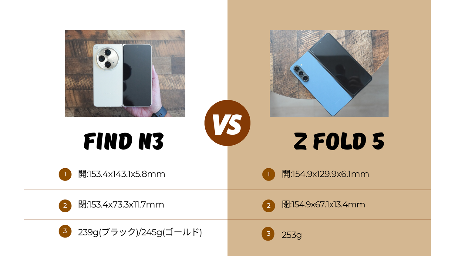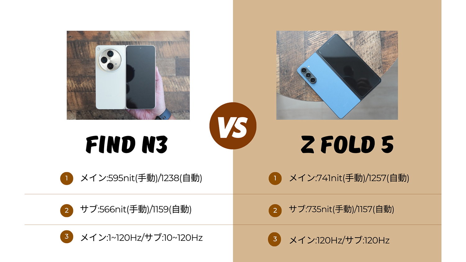 今回のサンプルはOppo Find N2/Oppo Find N3/Galaxy Z Fold 5の順番になっており、真ん中を中心にどのような違いがあるかで見てもらえると分かりやすいと思います。