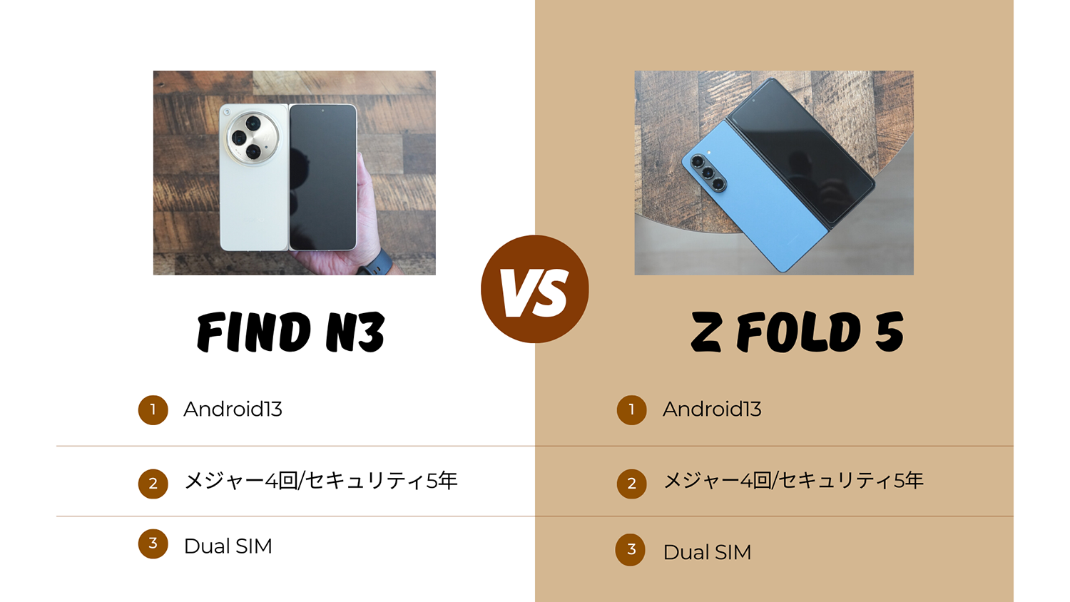 次に基礎スペックを確認していきたいと思いますがOppo Find N3はAndroid13の独自UIです。アップデートサポート期間はGalaxy Z Fold 5と同じで折畳式機種の中では最長クラスです。