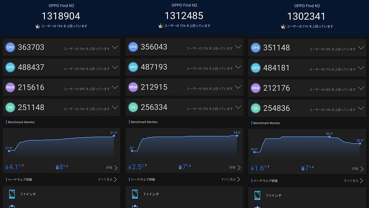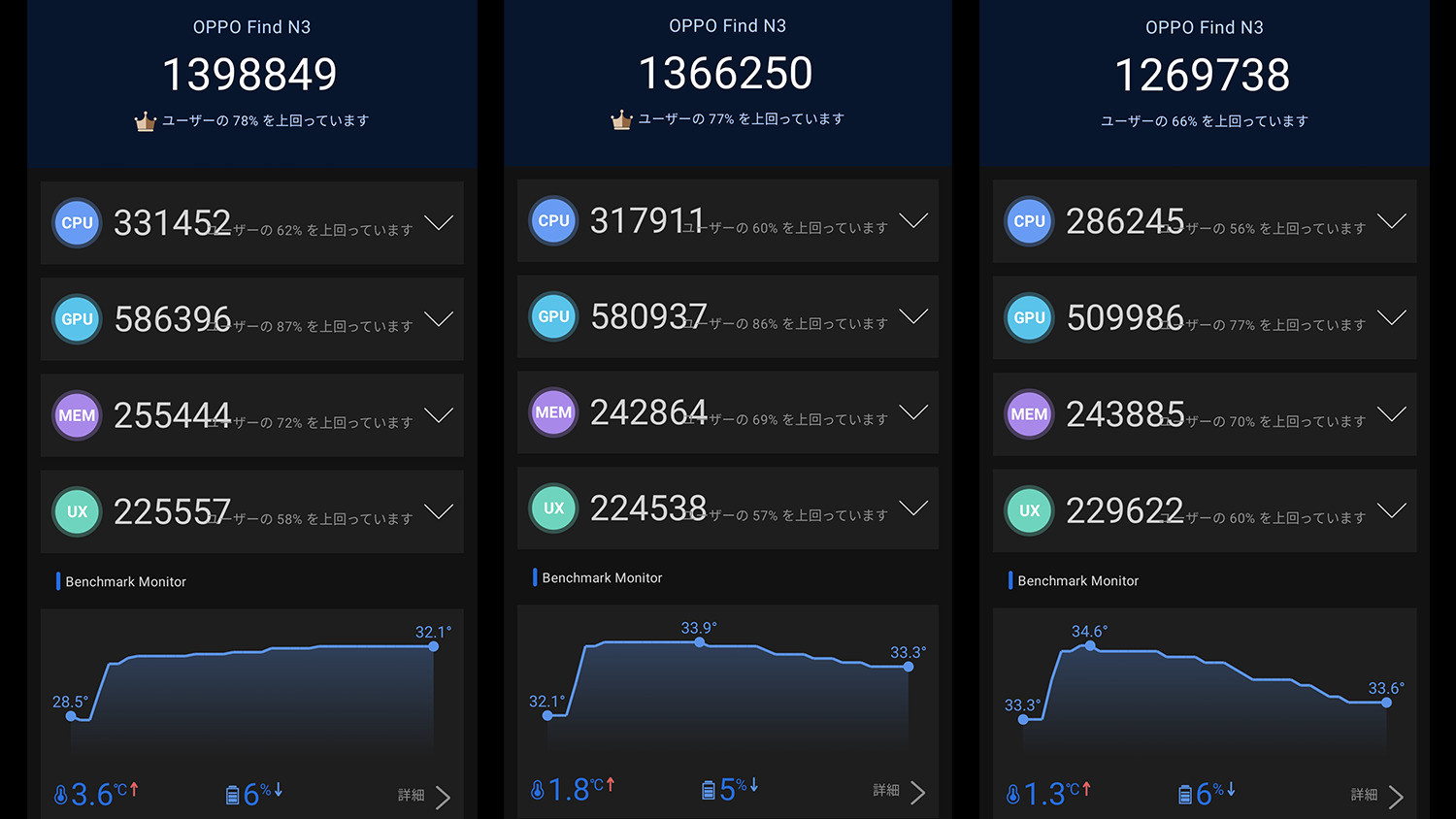 トップスコアという面でみるとGalaxy Z Fold 5ですが気になる部分として発熱のしやすさです。Oppo Find N3は余裕を持たせていることもあり内部温度も前モデルより低い上でスコアが高い。