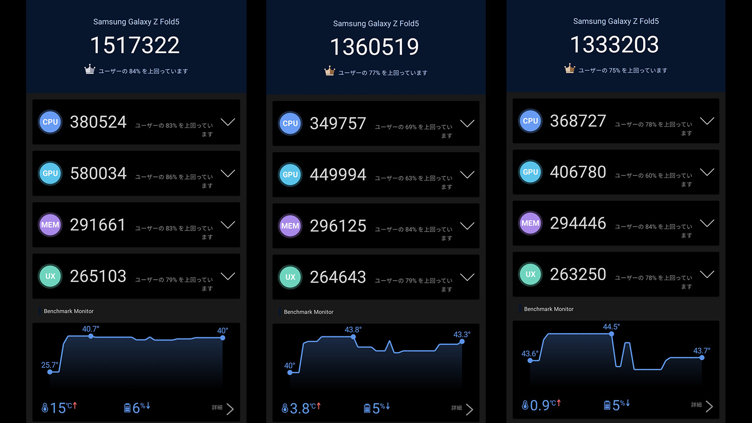 一方でGalaxy Z Fold 5は1回目で40度を超えており最高で44.5度とかなり発熱しています。合わせて計測終了ごとに外部温度を計測してみましたがGalaxy Z Fold 5は42.0/45.8/46.0度。
