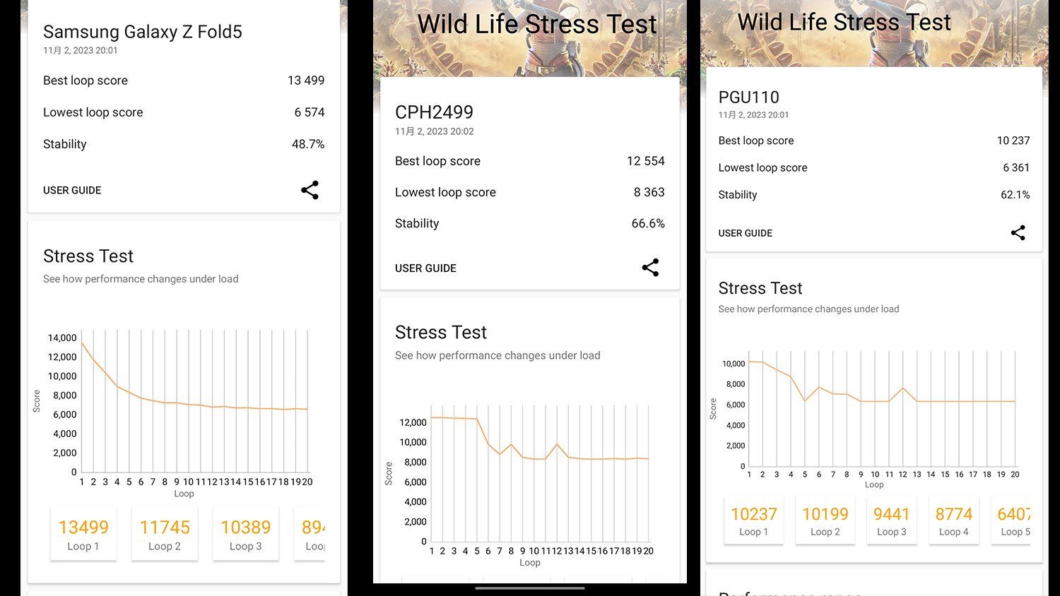 一応合わせてパフォーマンスの持続性を調べるために3D Mark Wild Life Stress Testを実施。発熱の程度で想像はつきましたがGalaxy Z Fold 5はスコアは高いけど安定率が48.7%と低い。