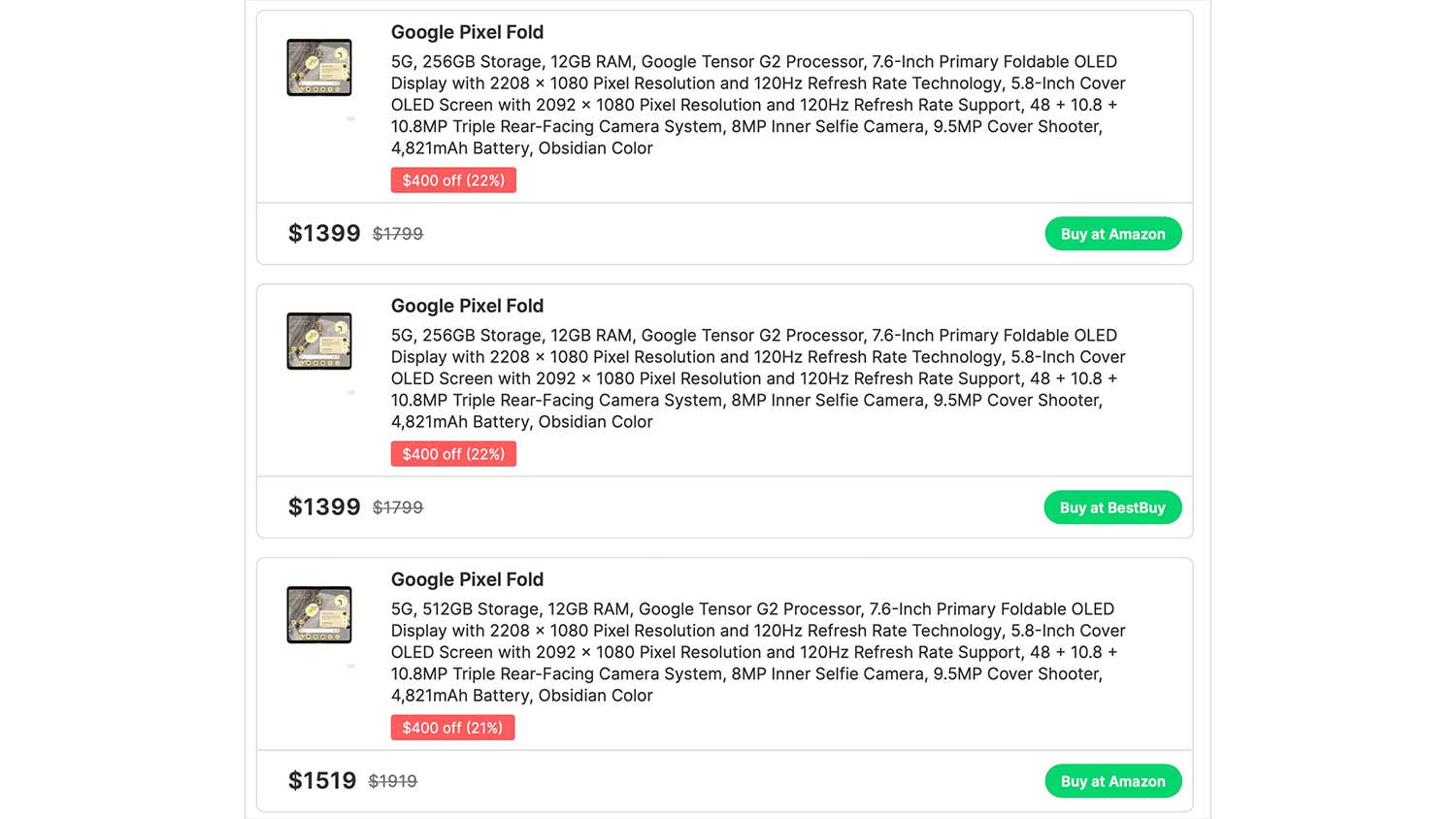 今回の情報によると米Amazonと米Best BuyにおいてPixel Fold/256GBモデルが$400の値引きで$1399で購入する可能であること報告しています。この値引き額は米Google Storeにおけるブラックフライデーセールの割引額と一致しています。