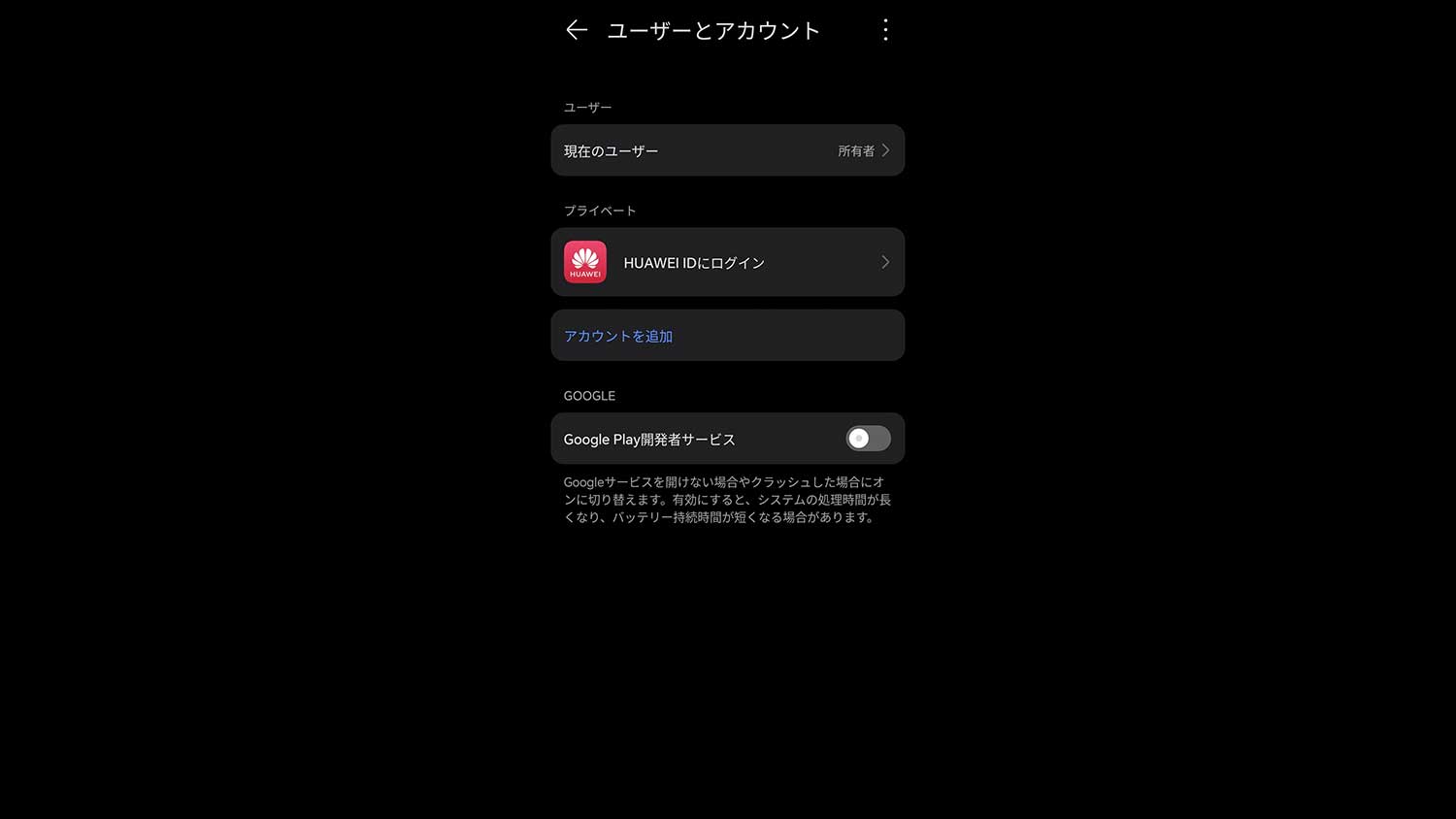 2回目のアップデートが完了すると設定/ユーザーとアカウントの項目に上記の画像から確認できるように「Google Play 開発者サービス」の項目が追加されるのでトグルをオンにしてあげます。