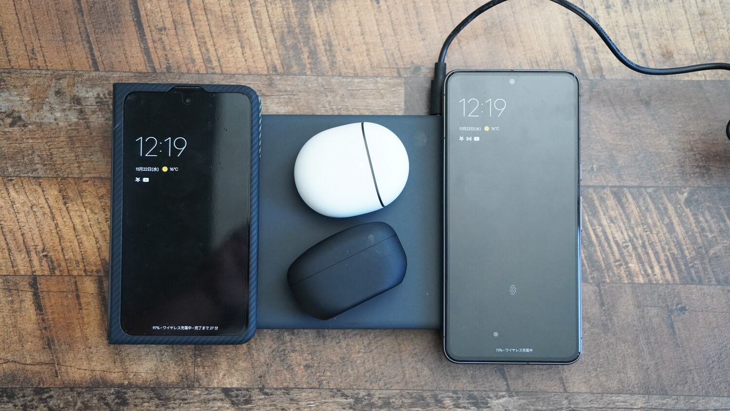やはり余裕を持たせておくことが出来るのは良いところでワイヤレス充電非対応の機種や充電速度を優先したい時などはAnker Prime Charging Stationにケーブルを挿して有線で充電。