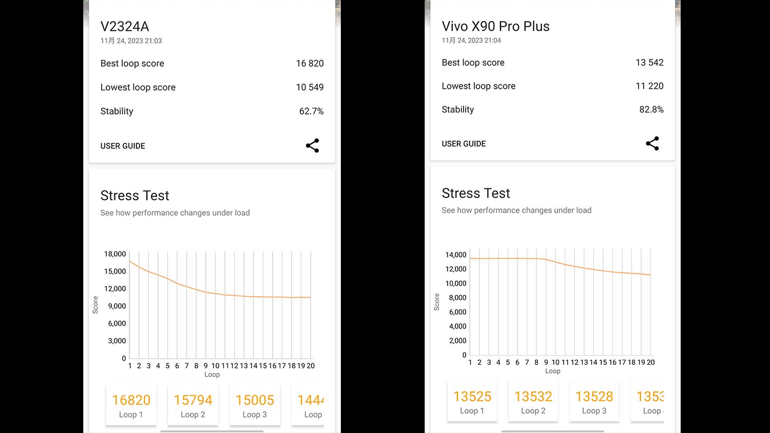 一応パフォーマンスの持続性を調べるために3D Mark Wild Life Stress Testを実施。Vivo X90 Pro+が82%と驚異的な安定率である一方で外部温度は49度とかなり熱めです。