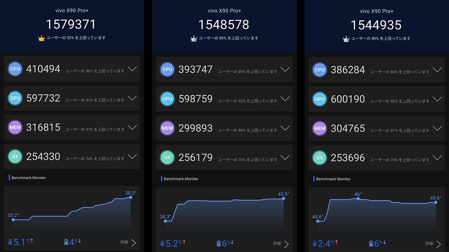 ただ3回目で見るとvivo X90 Pro+の方が46度とvivo X100 Proの方が最高温度はちょい低めという感じです。ちなみに計測終了のタイミングで外部温度を計測してみましたがvivo X90 Pro+は35.7/39.8/40.3度に対してvivo X100 Proは37.2/41.6/42.1度と全体的に高め。
