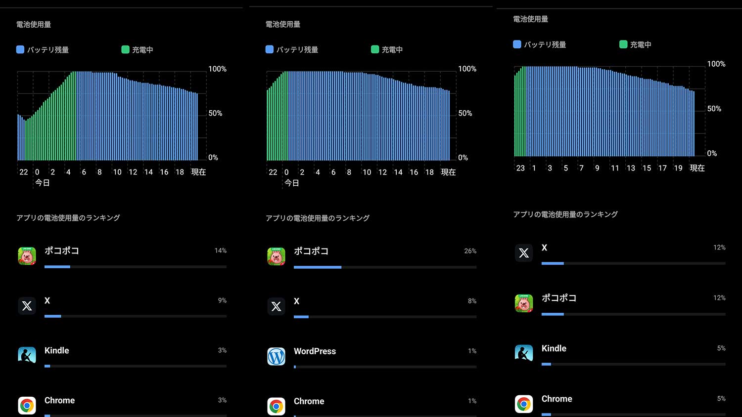 今年使ってきた機種の中でもXperia 5Ⅴに匹敵する感じでiPhone 15 Pro MaxやGalaxy S23 Ultraより電池持ちが良いと感じるので完全に想定外の電池持ちの良さです。