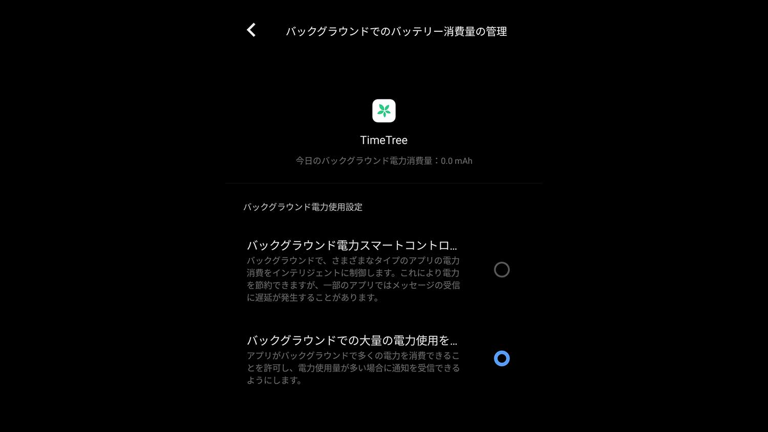 とりあえず本体のおすすめの設定にしておくと通知がこなくなるのでおすすめは選ばない。その上でバッテリーの設定からバックグラウンドでのバッテリー消費量の管理を選択してバックグラウンドでの大量の電力使用を許可する方を選んでおいてアプリの電力消費を認める。