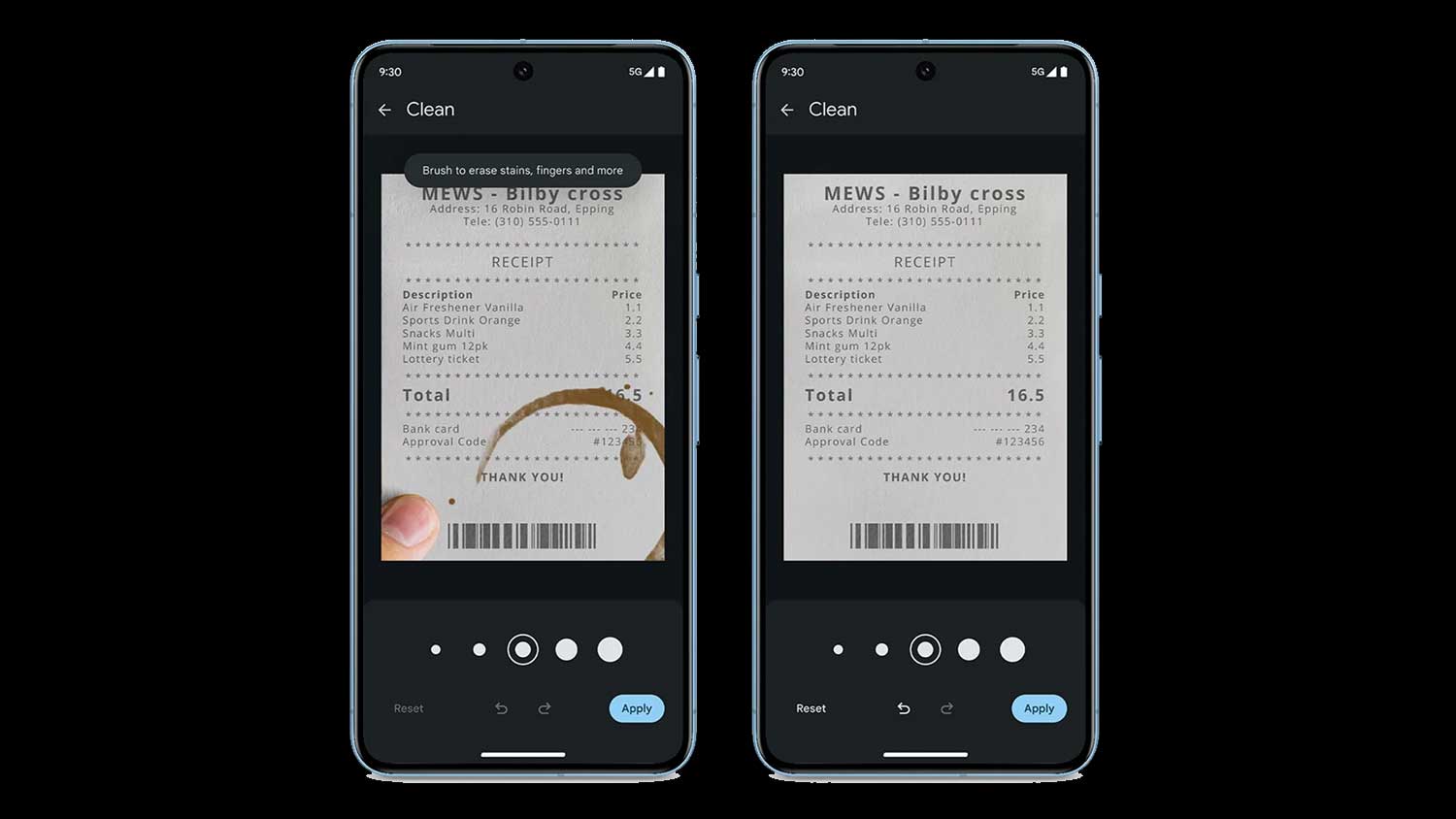 またPixelのカメラで何かスキャンした時にスキャンした文章から汚れやシワを削除する機能。