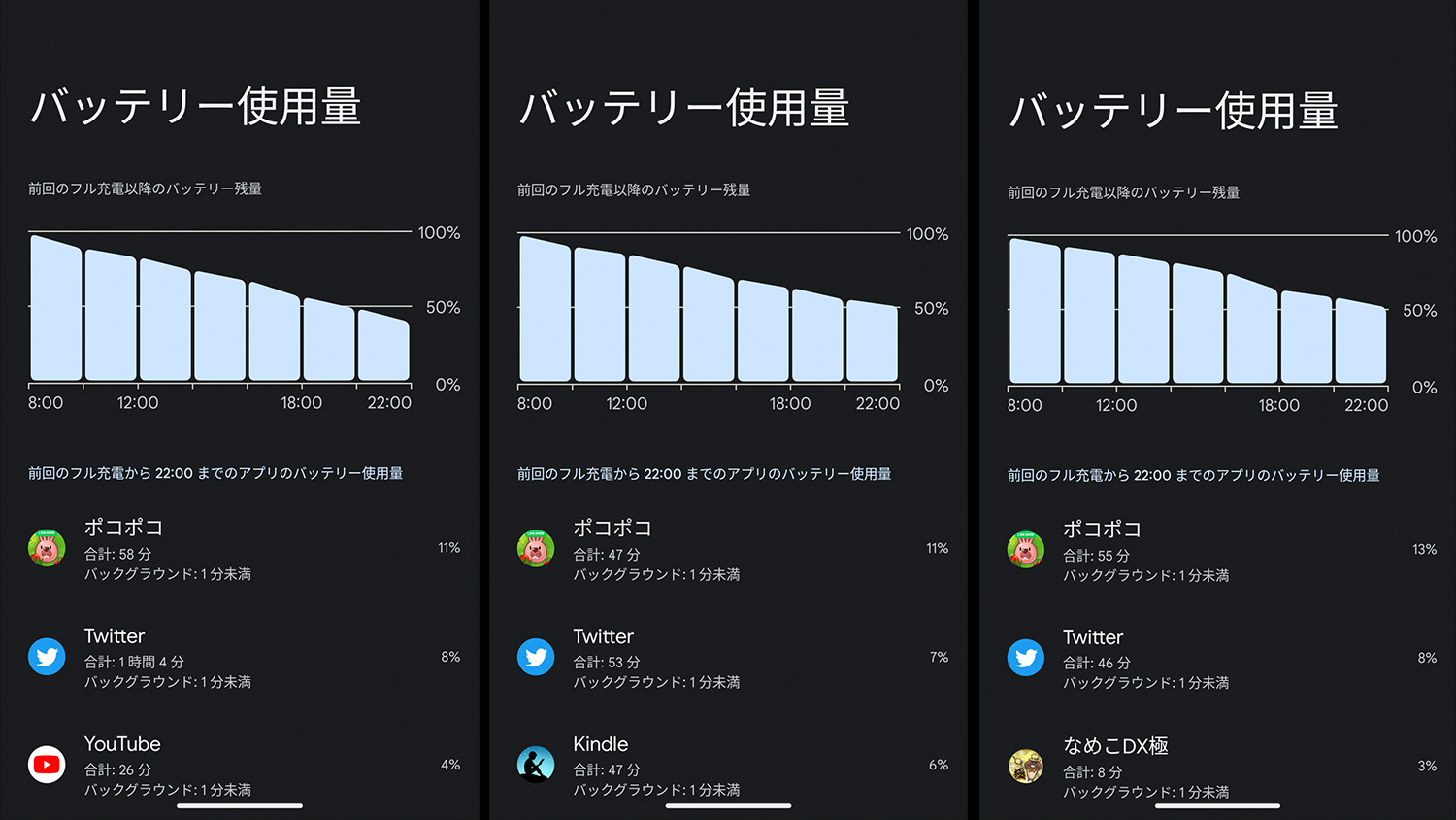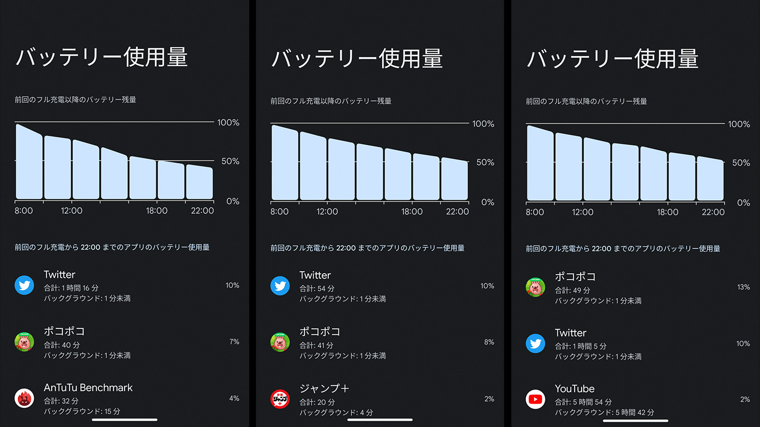 自分はゲームをしないためまだ燃費がいい使い方をしている方だと思いますが心許ないです。ただ一方でチューニングだけでは限界があると思うのでGoogle Tensorの抜本的な改革が必要。