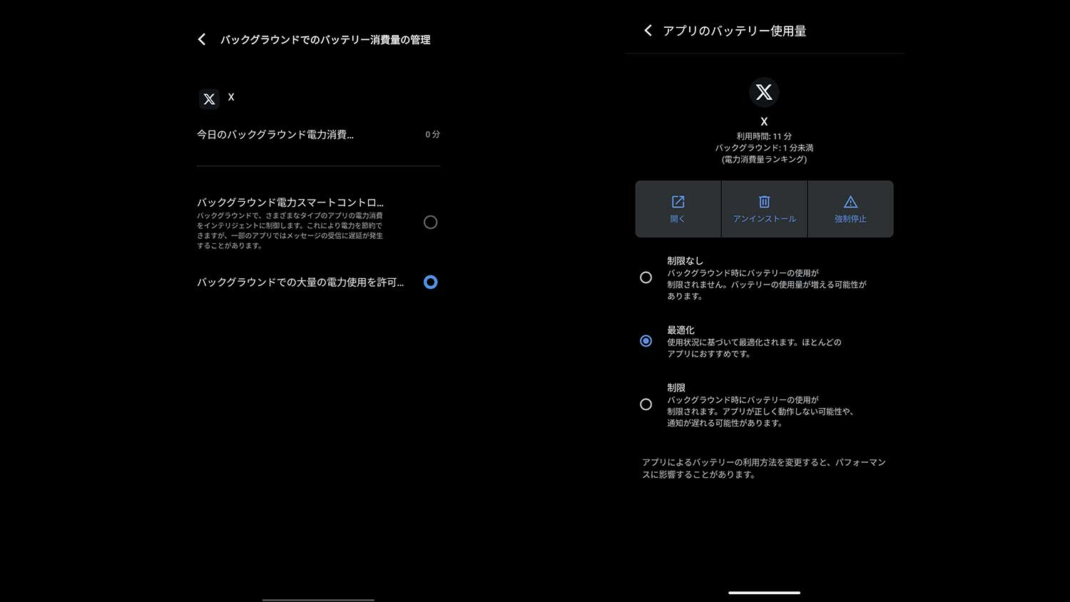 一方でグローバル版を確認すると制限なし/最適化/制限の3項目となっておりグローバル版を初めて購入したこともあり通知が遅れてほしくないアプリは制限なしを選択。