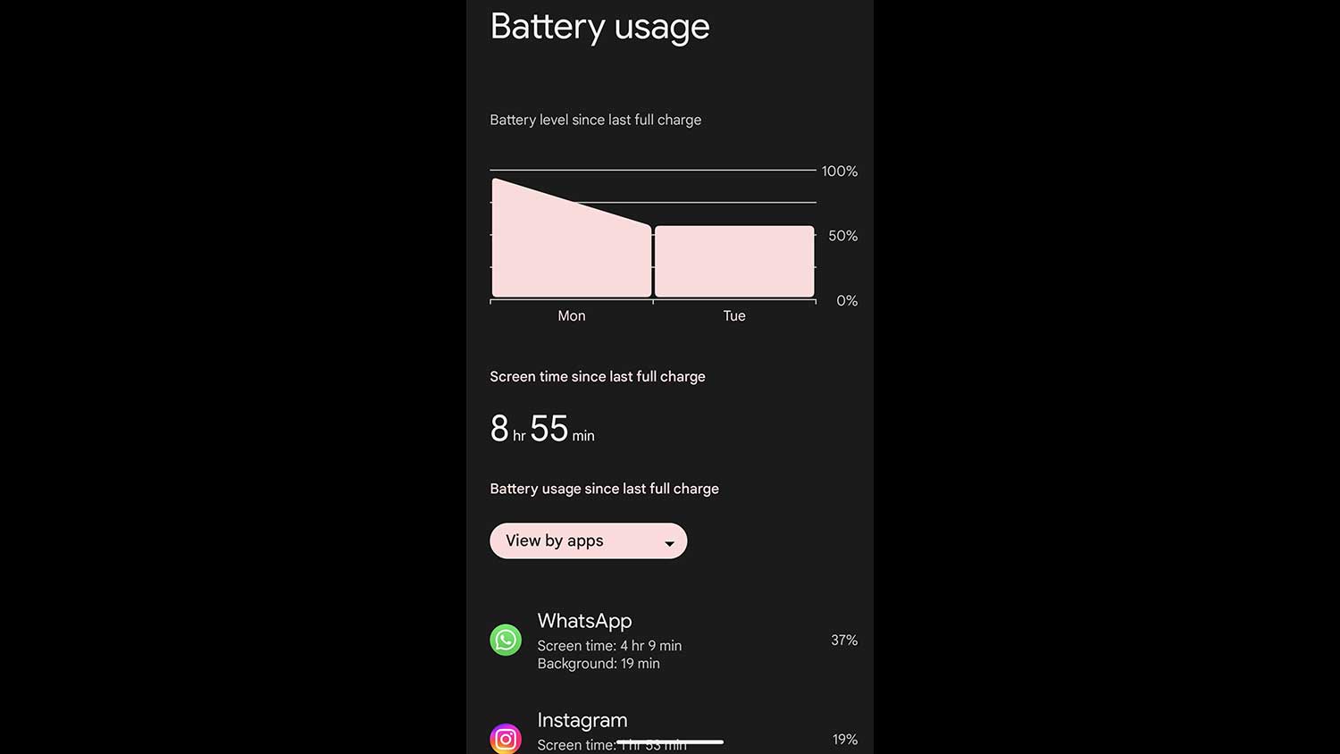約9時間のスクリーンタイムで電池残量が50%残っているのも驚愕ですがInstagramなど燃費が悪いアプリもそれなりに使っていてのこの結果は単純にすごいと思います。電池持ちが悪いと評価されるPixel 7aでこれだけもてば十分という感じ。
