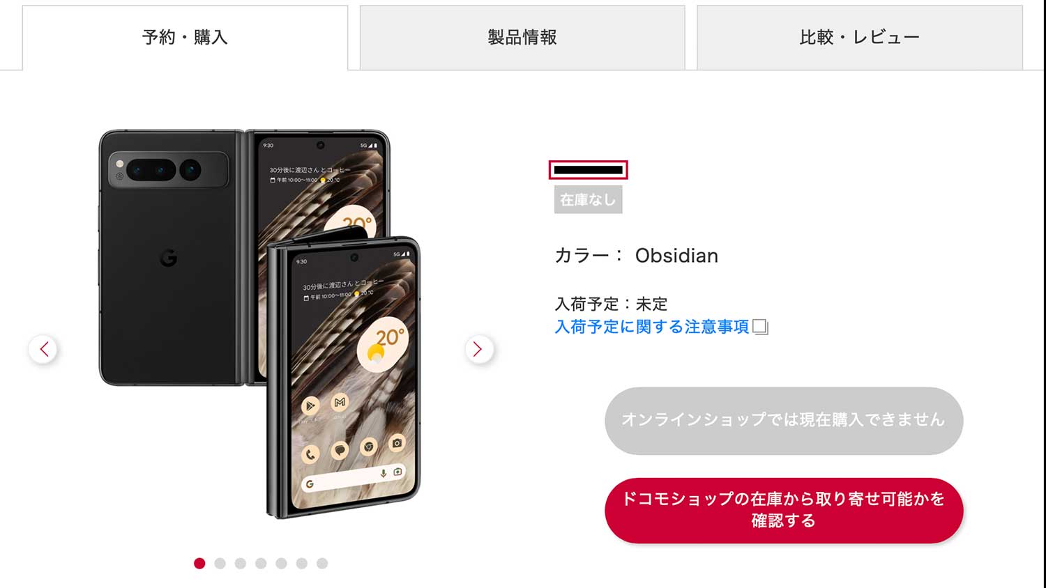 最近ちゃんとチェックしていませんでしたが久しぶりにドコモオンラインショップにおけるGoogle Pixel Foldの在庫状況を確認したところ、上記の画像のように「オンラインショップでは現在購入できません」と表示されていることを確認できます。