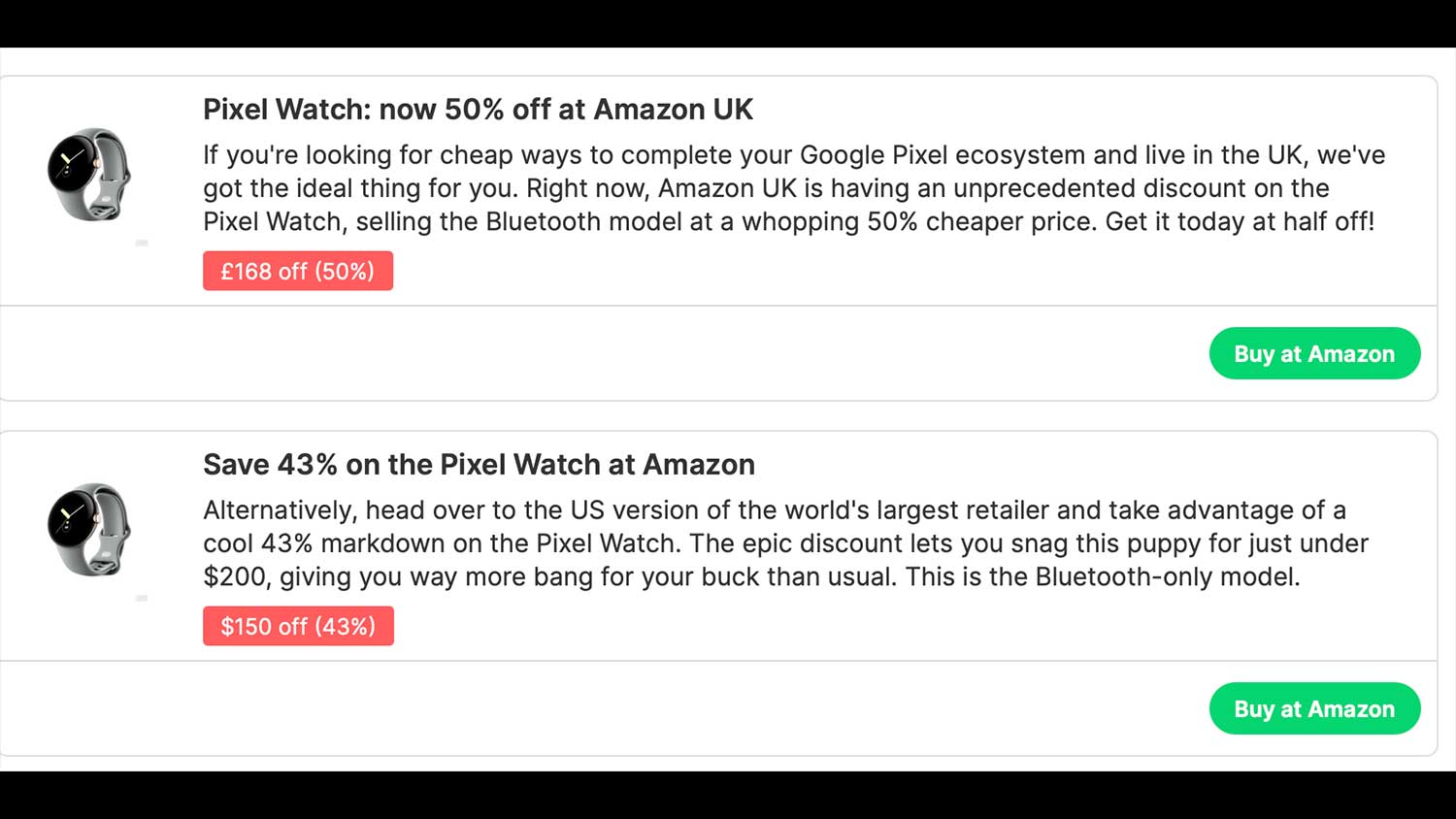 今回の情報によると英AmazonにおいてGoogle Pixel Watchが半額で販売されていることが判明したとしています。上記の画像からも£168オフで50%の値引きと試しに使ってみたいユーザーにとってかなり安いです。