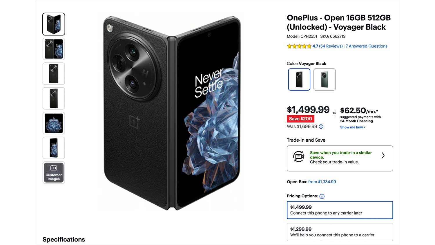 今回の情報によると米Best BuyにおいてOnePlus Openが史上最低価格になっていることが判明したとしています。上記の画像からも$200の値引きとなっており、さらに購入時にキャリアと契約することで$200の値引きを追加することができる。