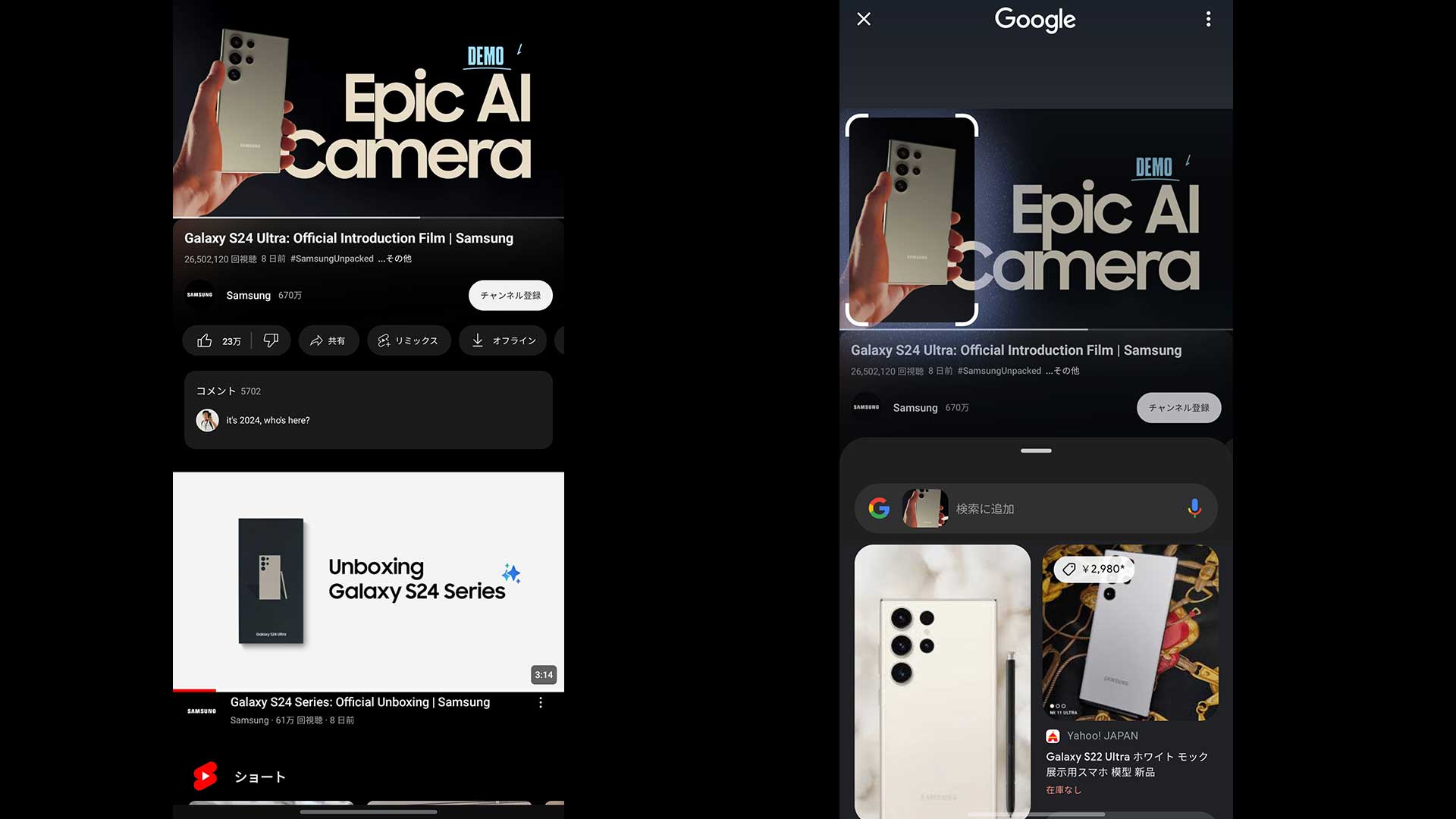 本体のAIスペックとGoogle Lensを使った新機能で対象物を指定してGoogleで検索。ちなみにこれはGalaxy S24シリーズだけではなくPixel 8シリーズも後日対応予定です。