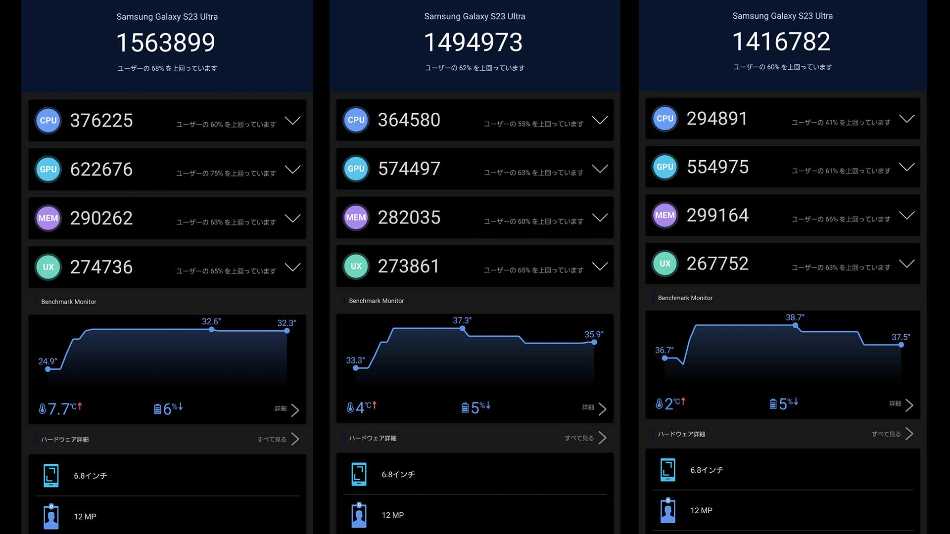 一方でGalaxy S23 Ultraに関しては内部温度はとりあえず40度を超えることはなかった。ちなみに計測終了ごとに外部温度を計測してみましたがGalaxy S23 Ultraは
