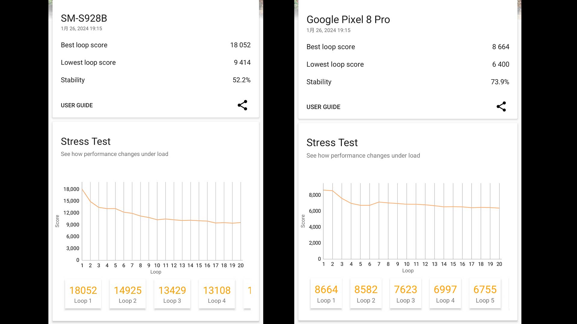 そして合わせて3D Mark Wild Stress Testを実施してみましたがPixel 8 Proは安定。スコアには大きな差がありますがゲームをそこまでやらないユーザーからすれば発熱がしにくくパフォーマンスも安定している機種の方が選びやすくここはユーザーの使い方次第かなと思う。