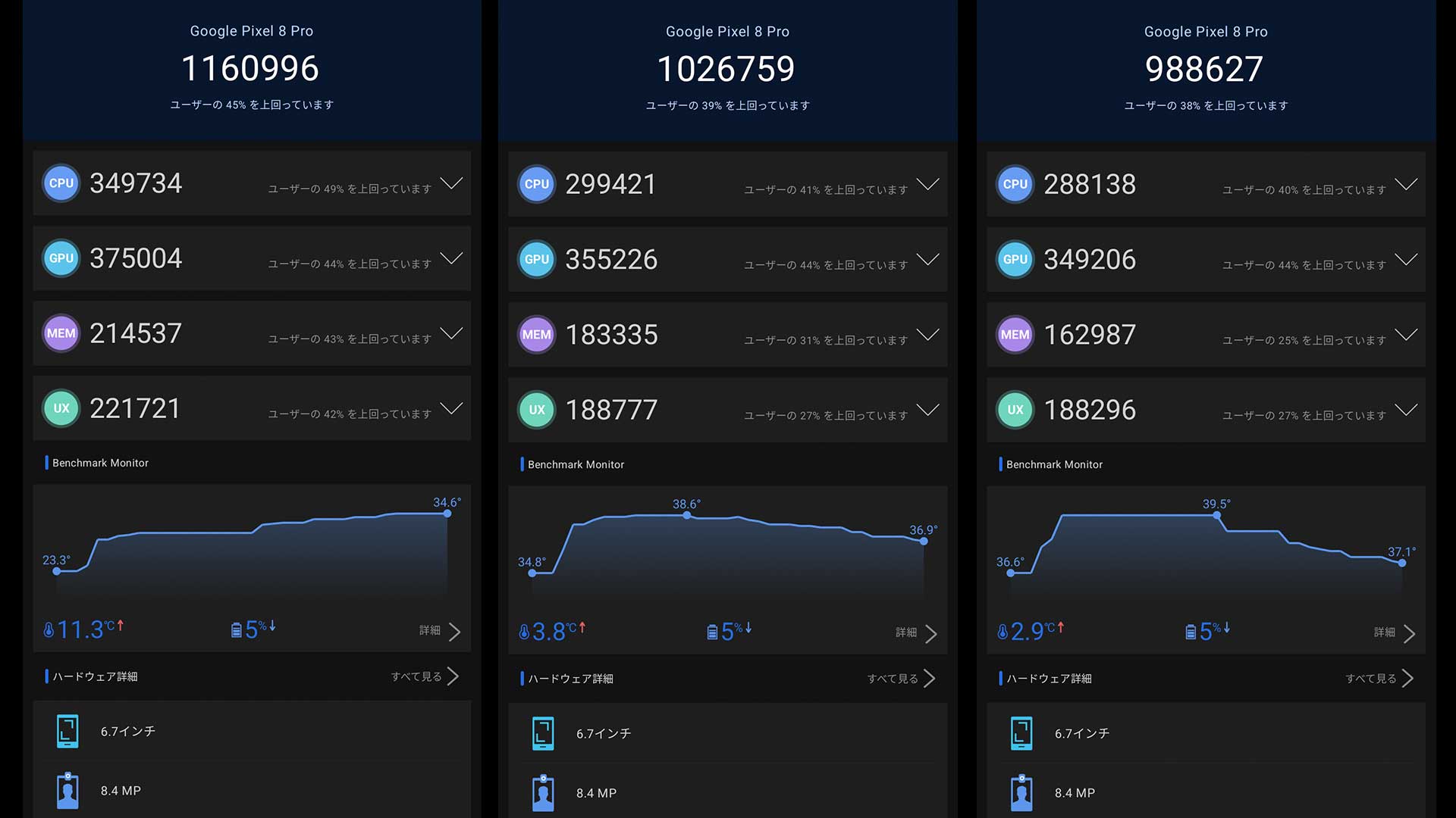 ちなみに計測終了ごとに内部温度を計測してみましたがPixel 8 Proは32.4/34.1/33.3度でGalaxy S24 Ultraは39.6/39.2/41.3度と持ち比べてみても大きな差をかんじます。