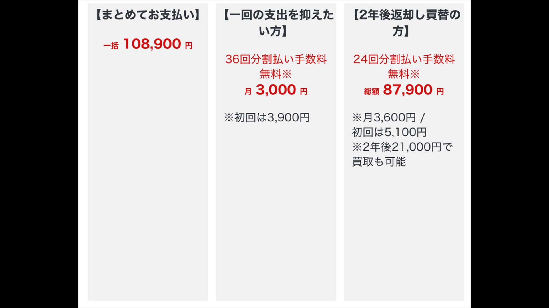 分割支払いの場合は36回払いに対して残価クレジットは24回払いで最終回に返却する流れです。残価クレジットは2年後に返却することで実質8万7900円で買い取る場合は別途2万1000円です。