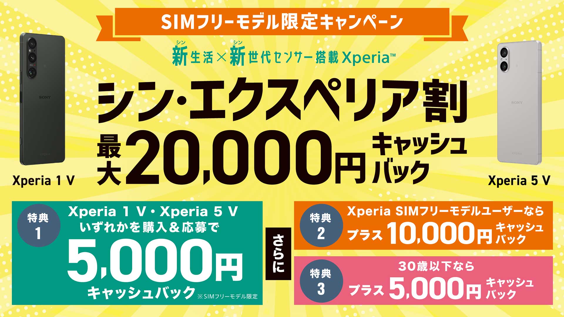 また購入期間が2月1日から4月5日の期間限定ですがXperia 1Ⅴはシン・エクスペリア割の対象。期間内に購入するだけで5000円のキャッシュバックに加え30歳以下なら合計1万円の還元。