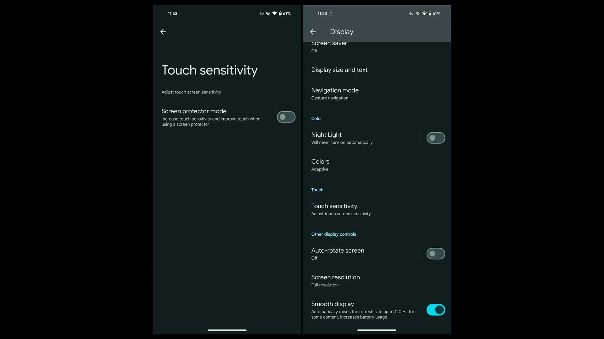 なので今後はユーザーが使っている環境に合わせてタッチ感度が調節される可能性があり、例えば雨が降っている時や寒い時などに合わせるという感じになります。画面内指紋センサーを搭載しているPixelであれば全て対応するのか。