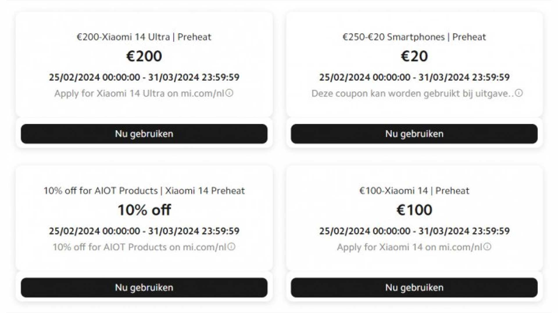 このクーポンの利用期間はXiaomi 14シリーズの予約期間と一致しているのかまでは現時点で不明です。ただ仮に一致しているのであれば4月1日にはオランダでXiaomi 14シリーズが発売される可能性があります。