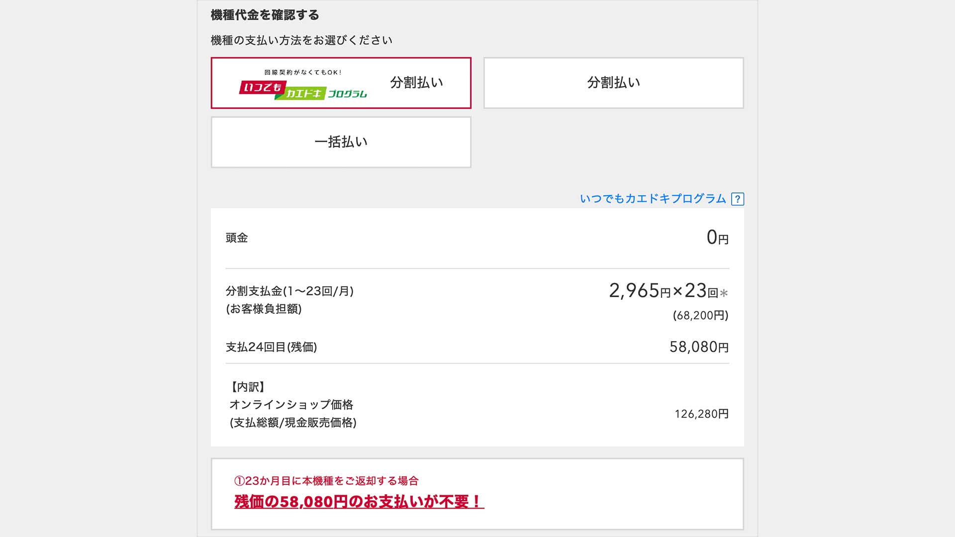 今まで割引額が変動することはありましたが定価が変更されることはなく今回初めて今回価格改定が行われて感じになります。ちなみにプログラム利用の場合は上記の画像からも実質負担金は6万8200円で2年後に返却することで5万8080円の残債が相殺になるという感じです。