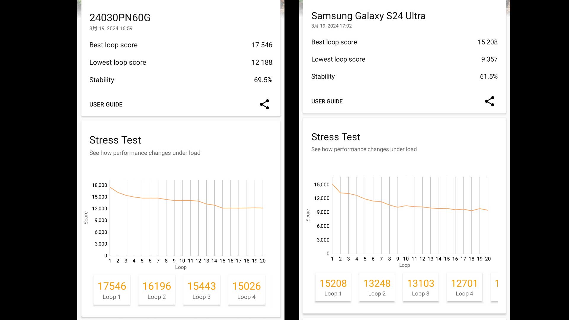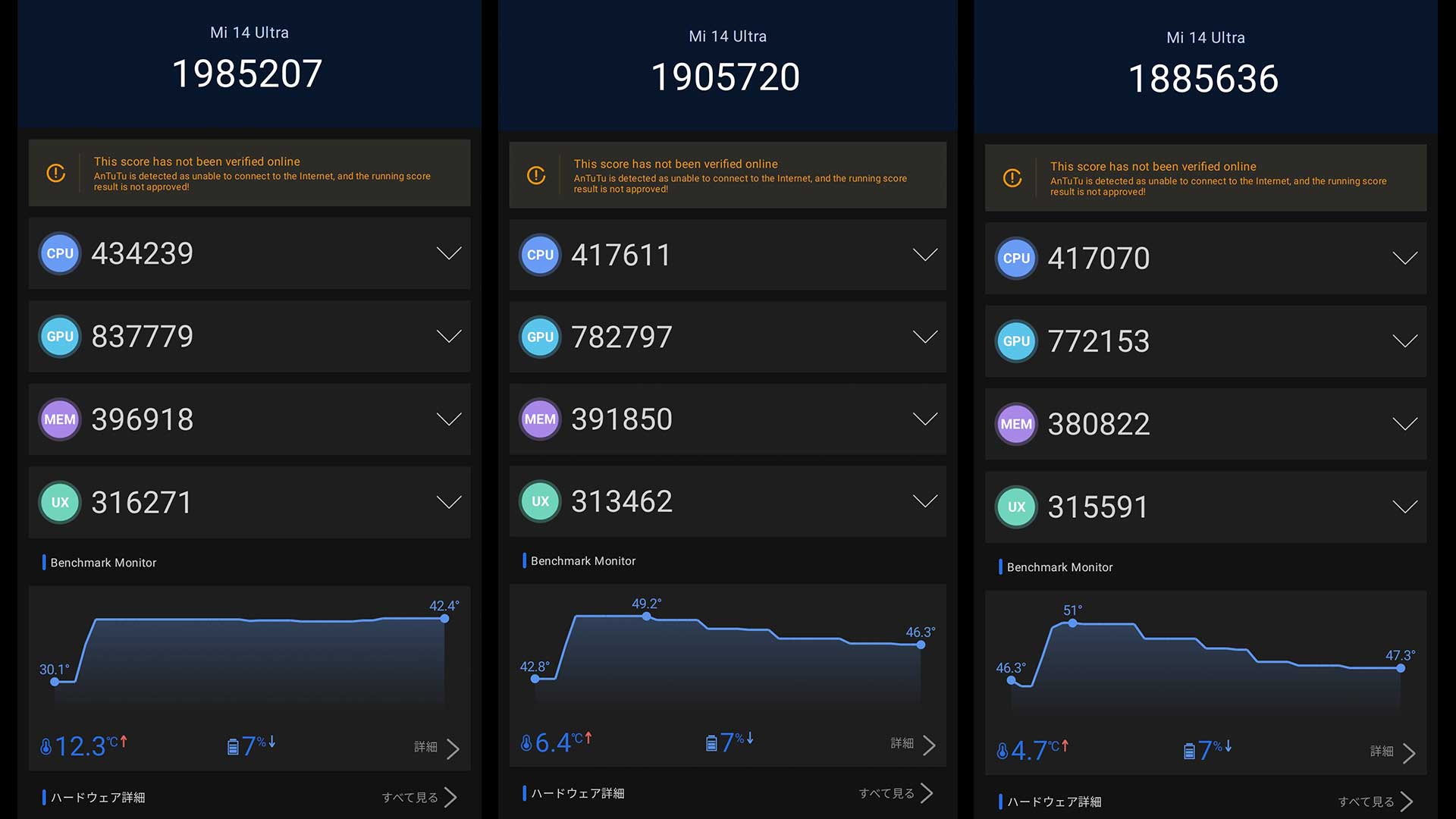 今回のベンチマークで判断する限りパフォーマンスの持続性はXiaomi 14 Ultraの方が優秀。ただ放熱性能をより強化した影響もあるのか発熱を感じやすくストレスになるかもしれません。
