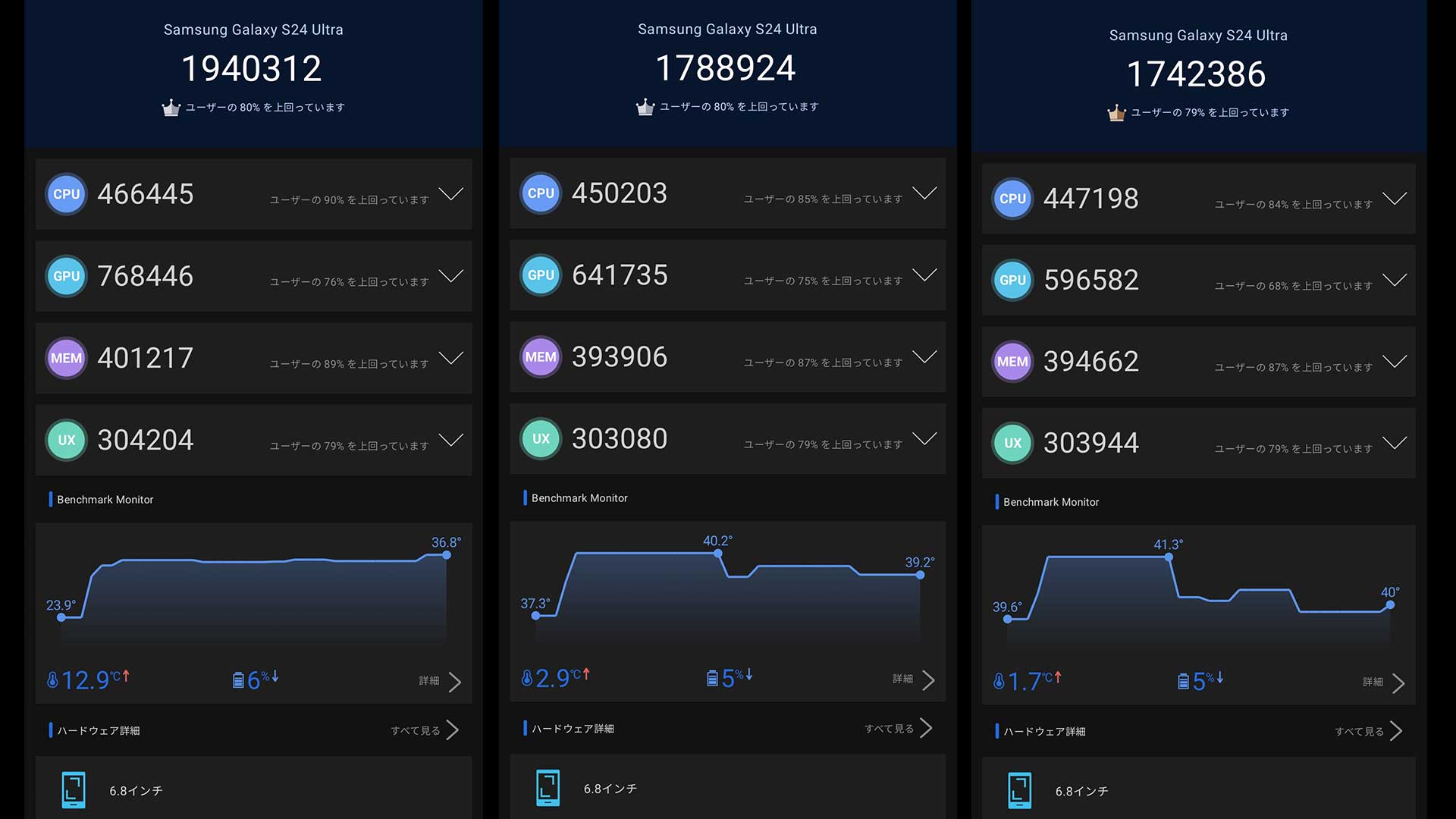 ちなみに計測終了ごとに外部温度も計測してみましたがGalaxy S24 Ultraは36.7/40.8/40.2度。一方でXiaomi 14 Ultraは38.6/41.1/41.3度と内部温度の割にはそこまで高くないです。