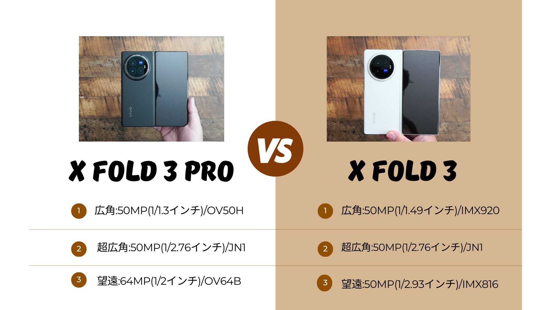 そして最後にカメラですがハードで見ると超広角は一緒ですがメインカメラセンサーに大きな差。またvivo X Fold 3 Proはペリスコープ仕様の望遠となっていますがvivo X Fold 3はポートレートセンサーという感じでズーム撮影もできるけどズーム目的ではないという感じです。