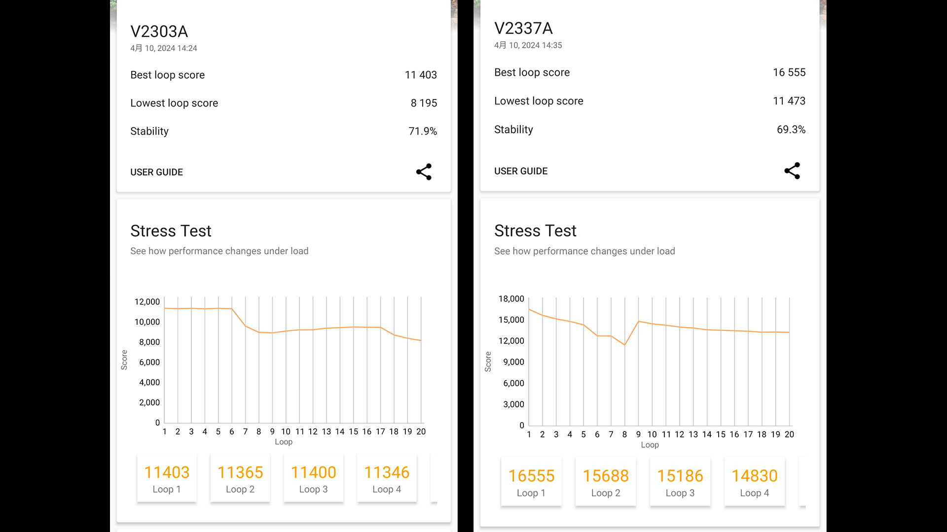 トップスコアにしろロースコアにしても大きな差がありますが安定率はvivo X Fold3が僅かに上。正直両機種ともフラッグシップモデルであることを考えると70%近く出ているので優秀だと思う。