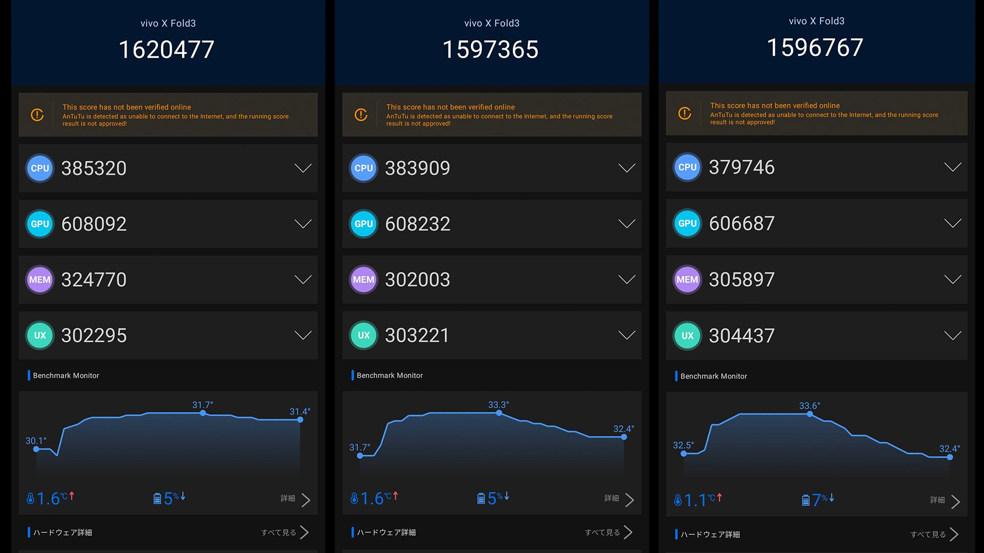 一方でvivo X Fold 3 Proは40度近くまで上昇するとスロットルダウンをかけている印象。また計測終了ごとに外部温度を計測してみましたがvivo X Fold 3 Proは32.1/33.6/36.5度でvivo X Fold 3は36.5/35.1/36.3度と本体が薄いこともあるのか外部温度が高め。